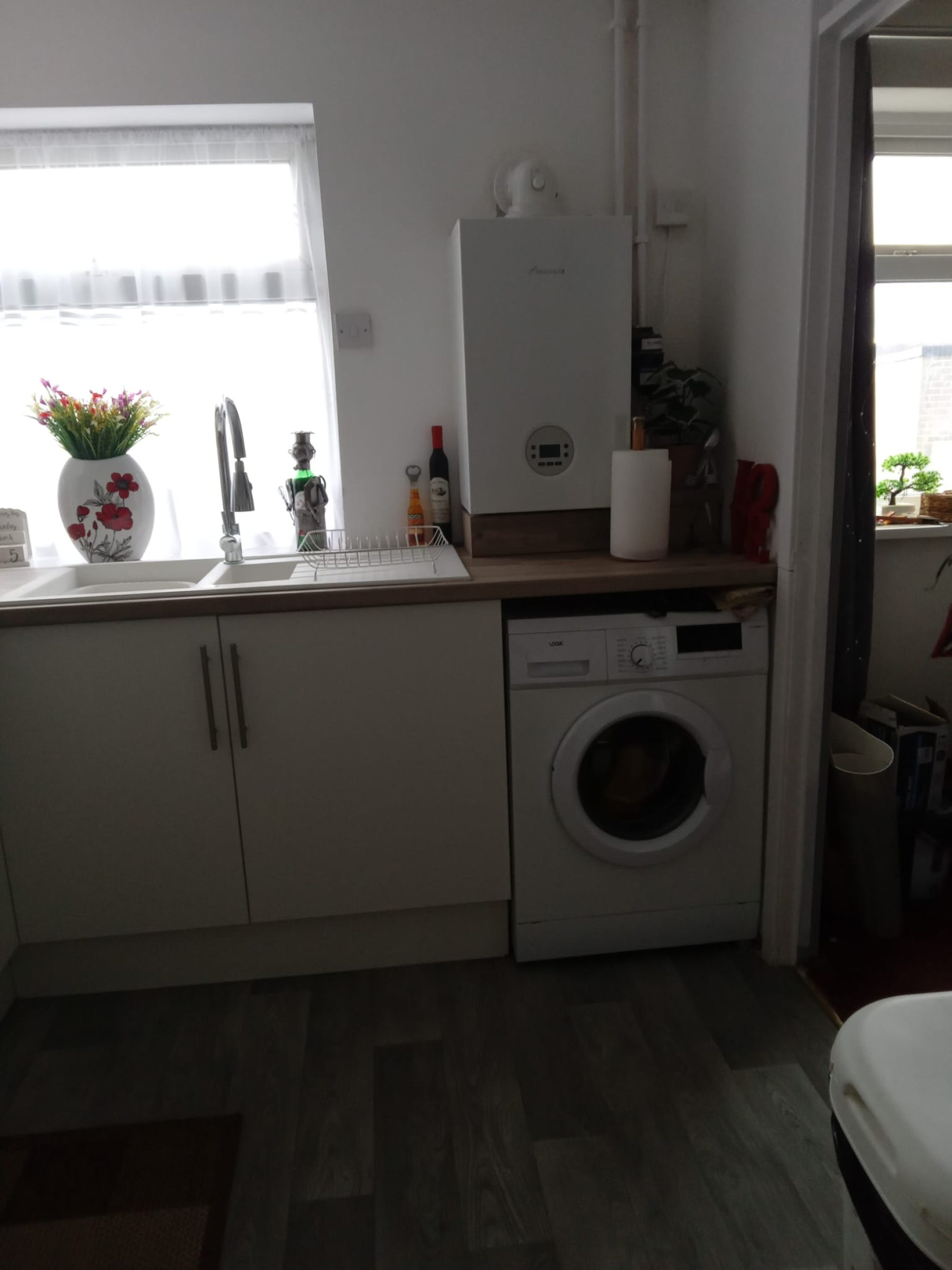 Fitted with a modern range of wall and base units with roll-top work surfaces incorporating a one-and-a-half bowl sink and drainer with mixer tap. Integrated electric oven and four-ring gas hob, under-counter space and plumbing for a washing machine, wall-mounted Worcester Bosch combination boiler, useful storage alcove and cupboard, and vinyl floor covering.