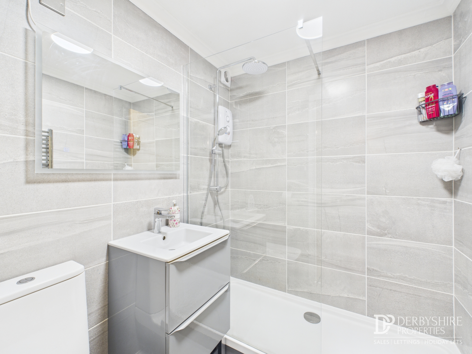 A beautifully fitted modern shower suite comprising a low-level WC, vanity wash hand basin, and a large shower enclosure with mains-fed shower and glass screen. The room benefits from fully tiled porcelain walls, a chrome heated towel rail, and a wall-mounted extractor fan.