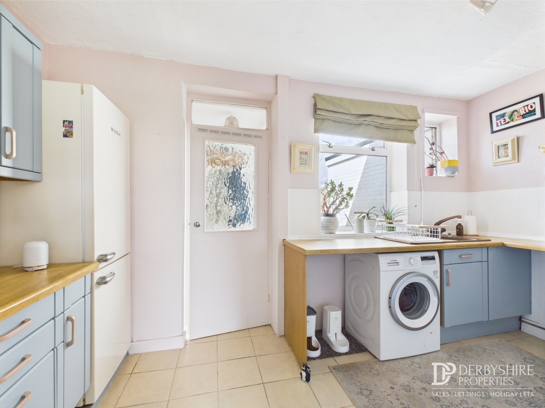 Comprising of a range of all and base mounted matching units with roll top worksurfaces incorporating a sink drainer unit with mixer taps and under the counter space and plumbing for both washing machine and dryer. Wall mounted radiator, tiled floor covering, integrated four ring gas hob with extractor hood and double electric oven. Space for fridge freezer and door and window to the rear elevation.