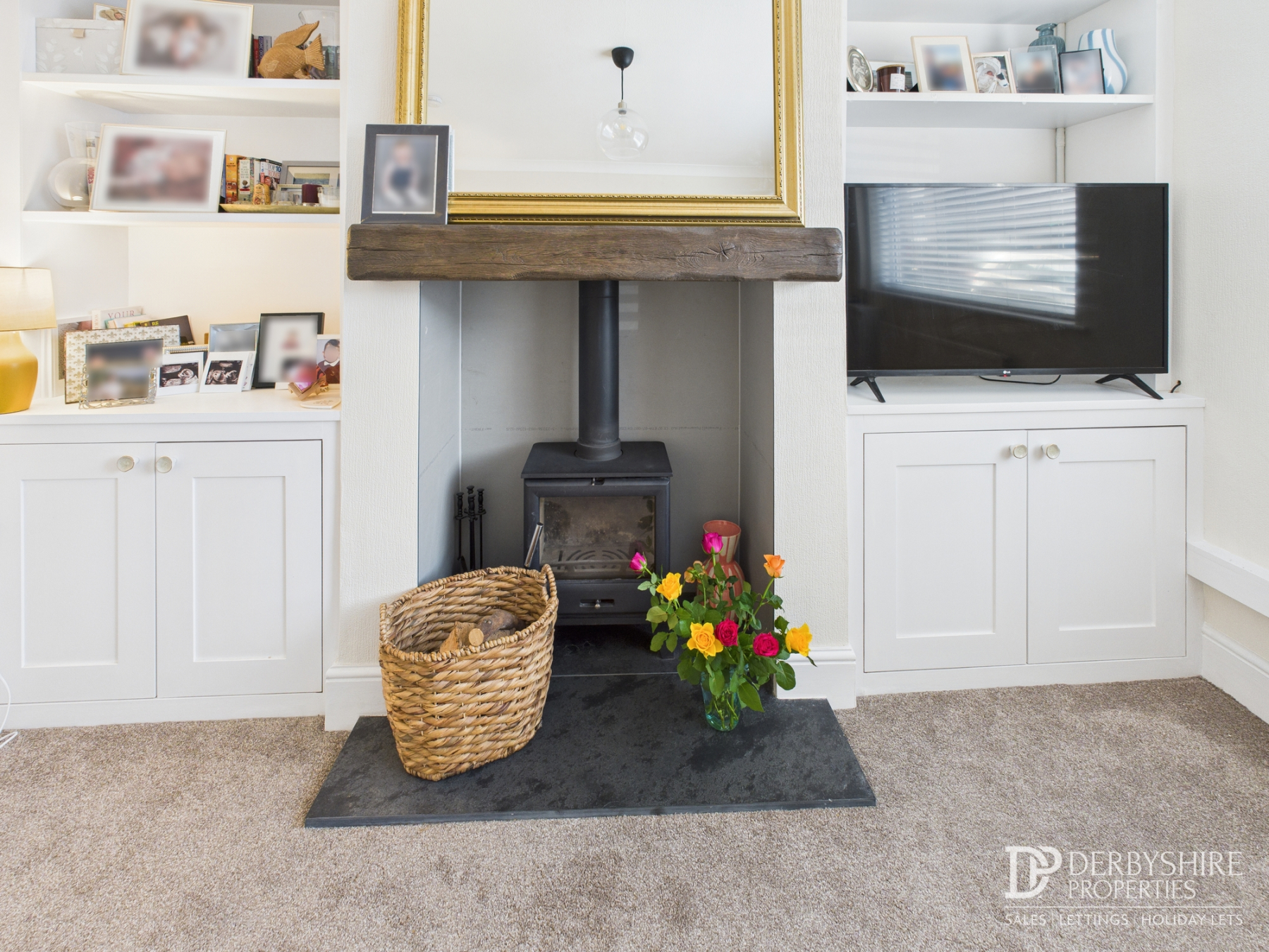 The property is accessed via a composite entrance door opening into a light and airy living room, featuring a stunning cast-iron log-burning stove set within a feature fireplace with exposed timber lintel. Either side of the fireplace are bespoke fitted bookcases with shelving and storage. The room also benefits from a double-glazed window to the front elevation, TV point, wall-mounted radiator, and an internal door leading to the dining area.
