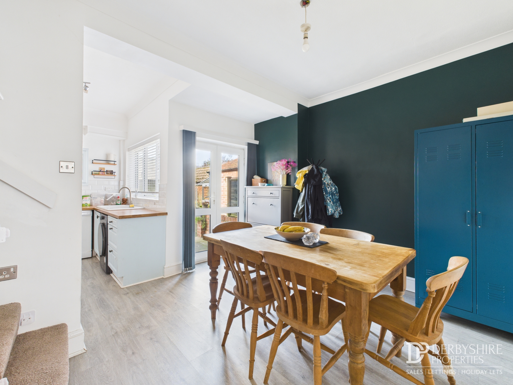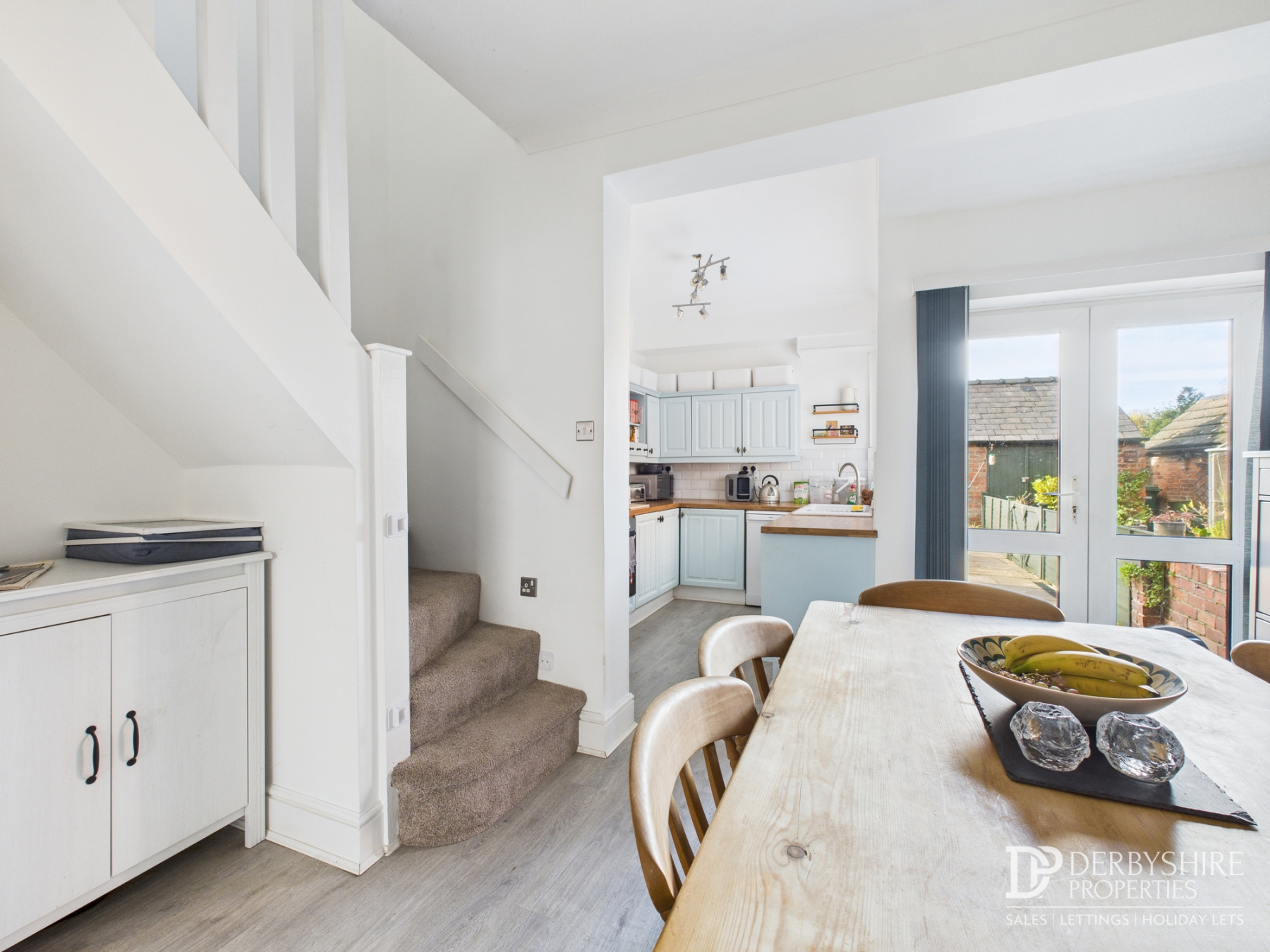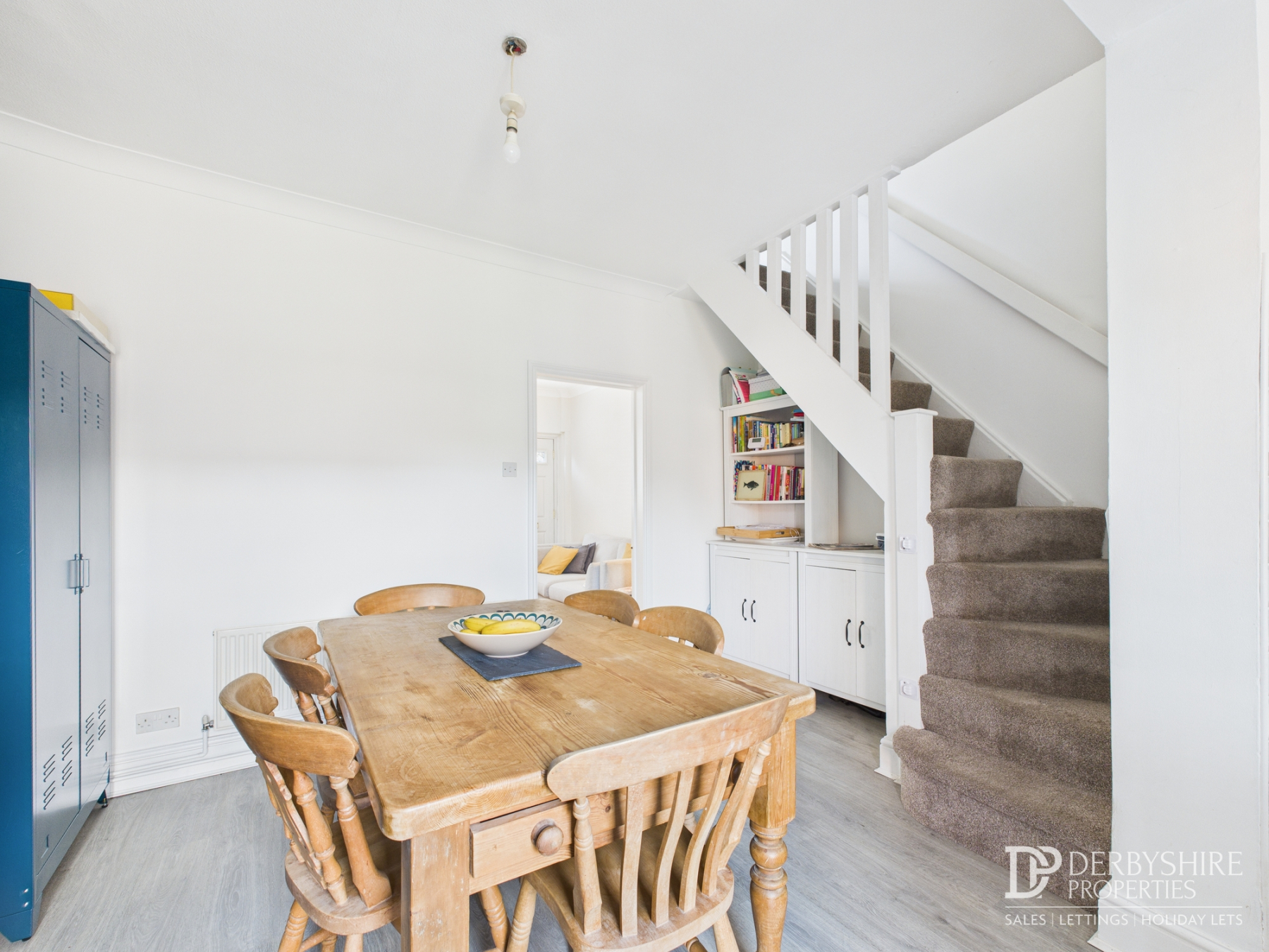 The dining area features an open-plan staircase to the first-floor landing, decorative coving to the ceiling, wall-mounted radiator, and wood-effect flooring which continues seamlessly into the kitchen. A double-glazed door with adjoining window provides direct access to the rear courtyard garden.