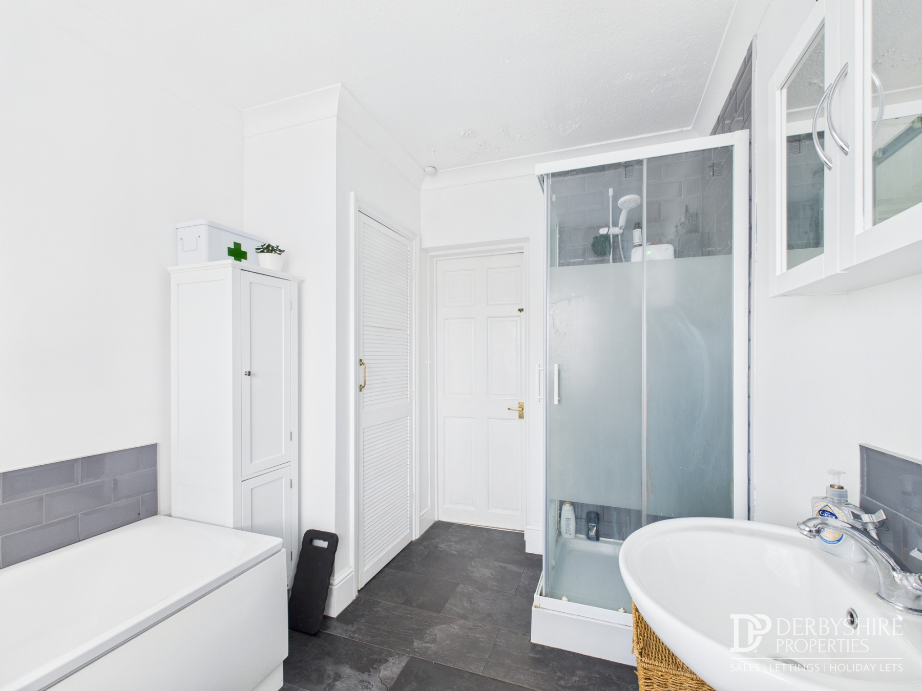 The bathroom comprises a modern four-piece suite including WC, pedestal wash hand basin, panelled bath with shower attachment, and a separate shower enclosure with wall-mounted electric shower. Finished with part wall tiling, tiled flooring, a modern vertical radiator, double-glazed obscured window, and a useful linen/storage cupboard.