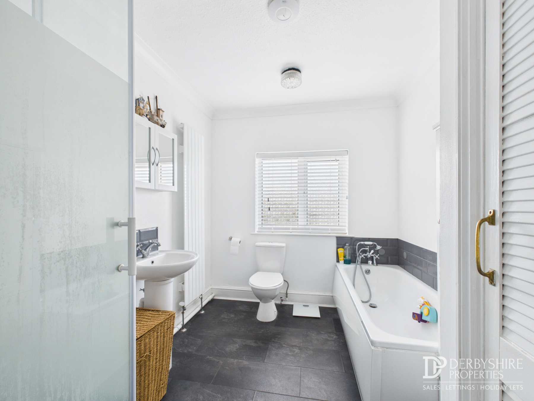 To the first floor, a landing provides access to two bedrooms and the family bathroom, with a wall-mounted radiator and loft access point.