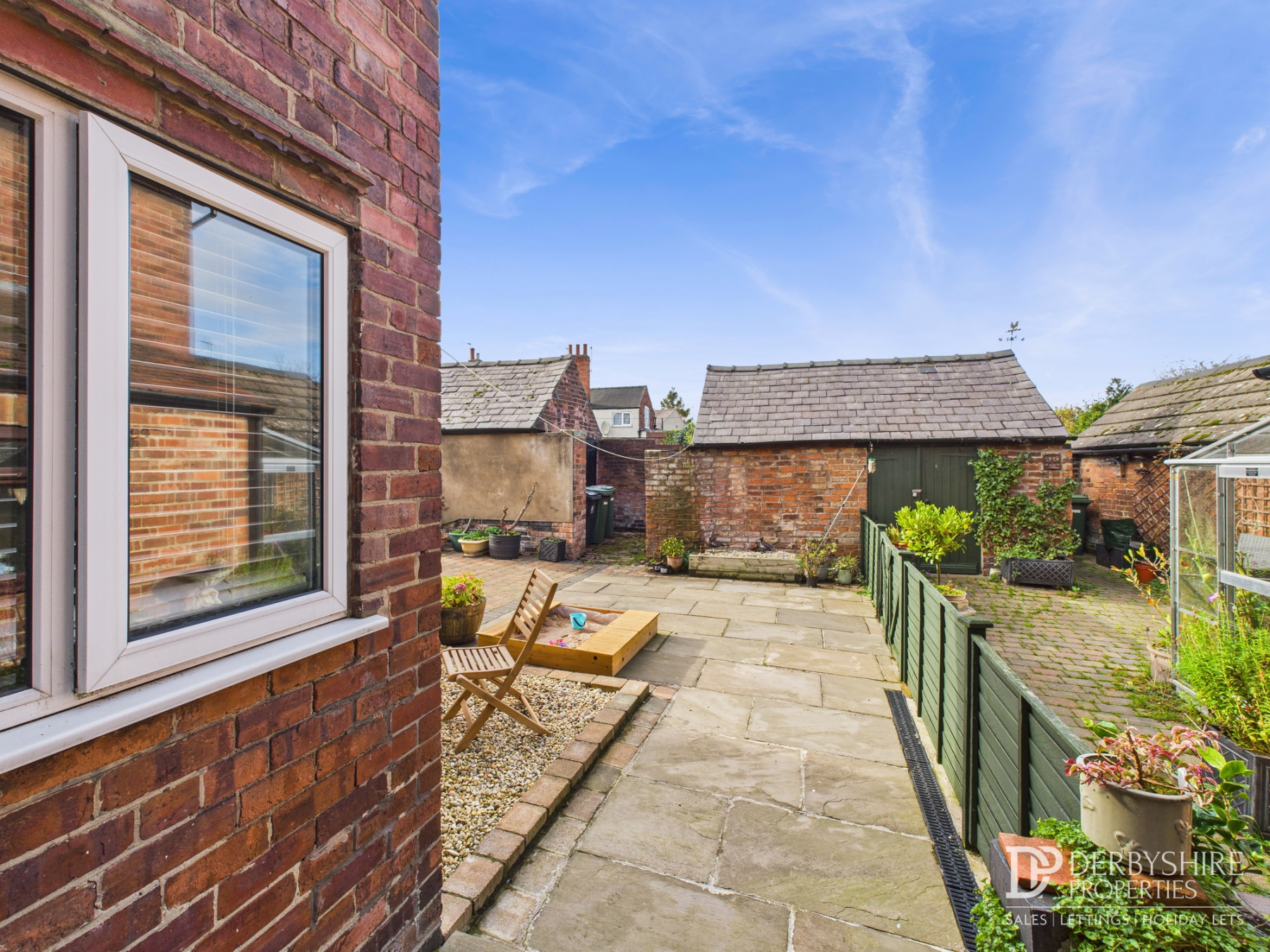 To the rear, the property enjoys a low-maintenance courtyard-style garden with a gravel seating area, perfect for outdoor dining or relaxation. This leads to a brick-built outbuilding, ideal for secure storage.