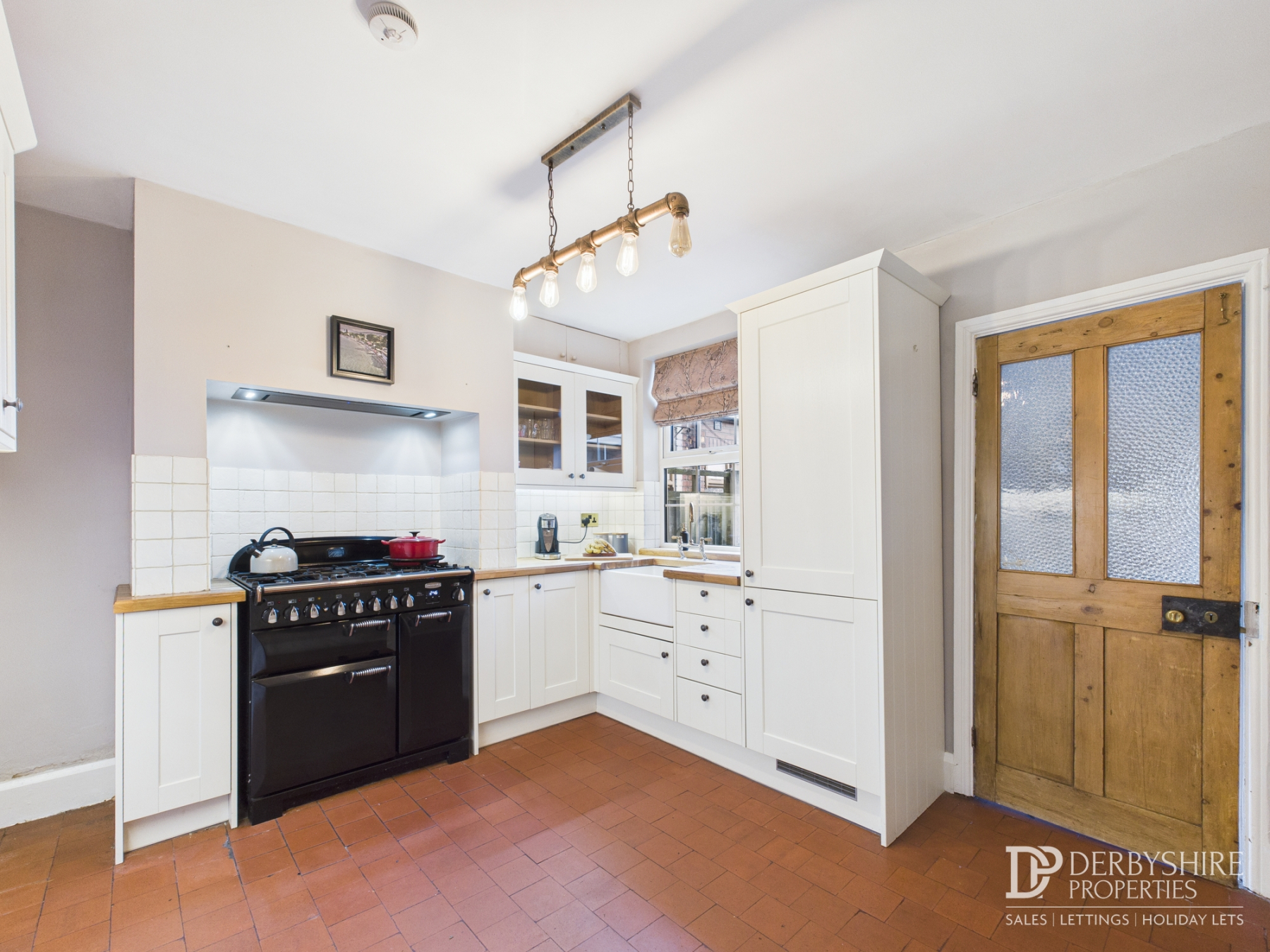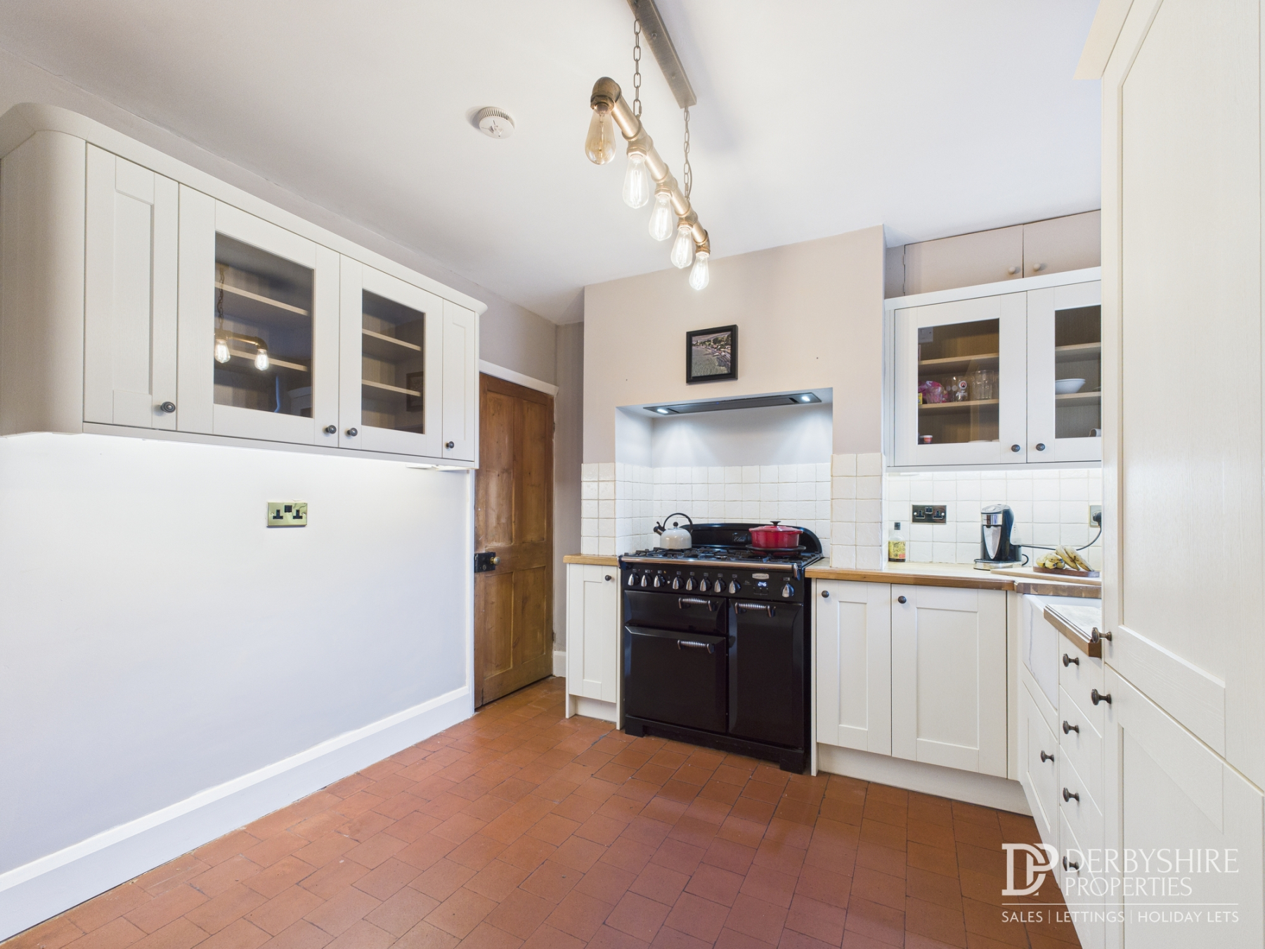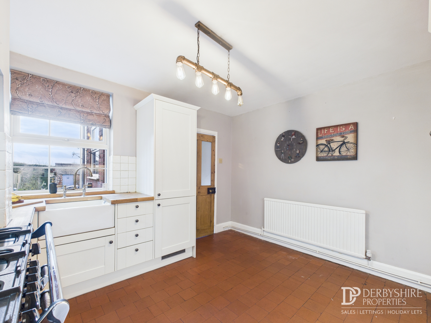 A light and airy space fitted with a range of shaker-style wall and base units with solid wood worksurfaces incorporating a Belfast sink. The focal point is the gas range cooker with inbuilt extractor and tiled splashbacks. Further features include original quarry tiled flooring, under-stairs pantry storage, integrated fridge/freezer, wall-mounted radiator, double-glazed window to the rear elevation and ample space for a dining table. An original internal door leads to: