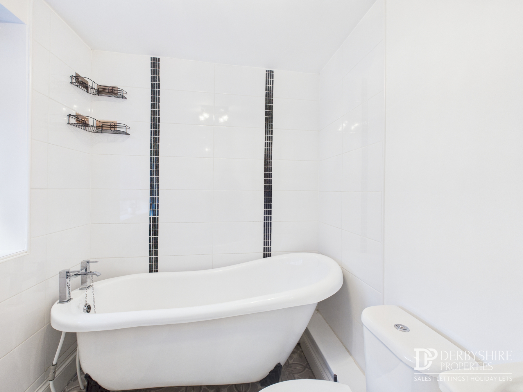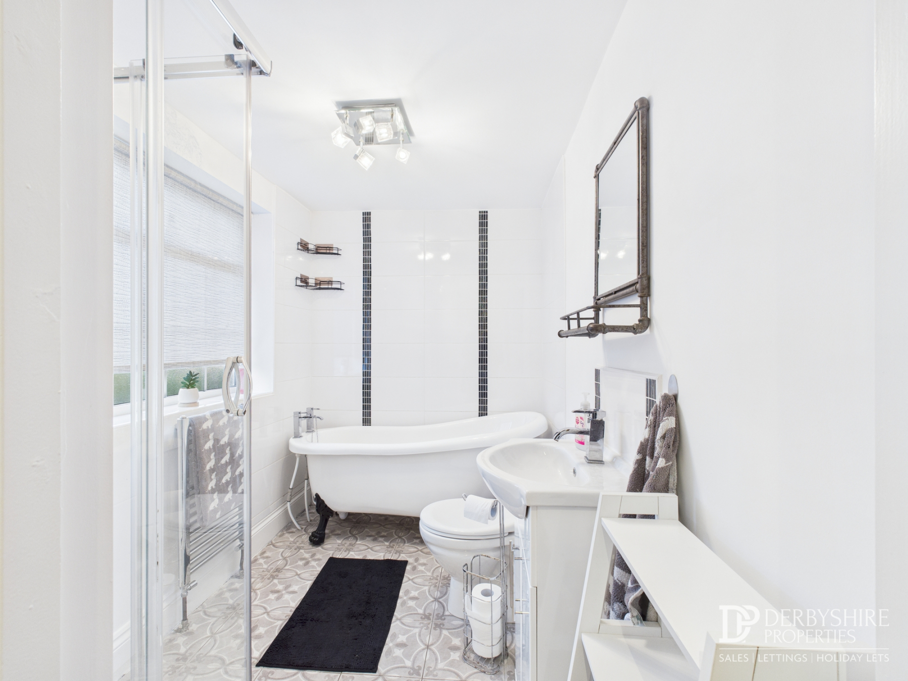 A beautifully appointed four-piece suite comprising low-level WC, slimline vanity unit, separate shower enclosure with mains-fed shower and a roll-top bath with claw feet. The bathroom further benefits from part-tiled walls, chrome heated towel rail, tiled flooring and double-glazed obscured window.