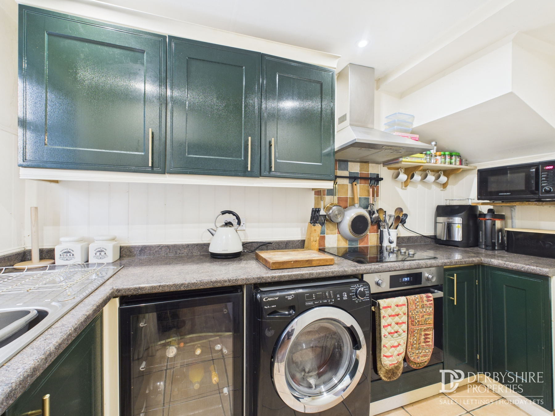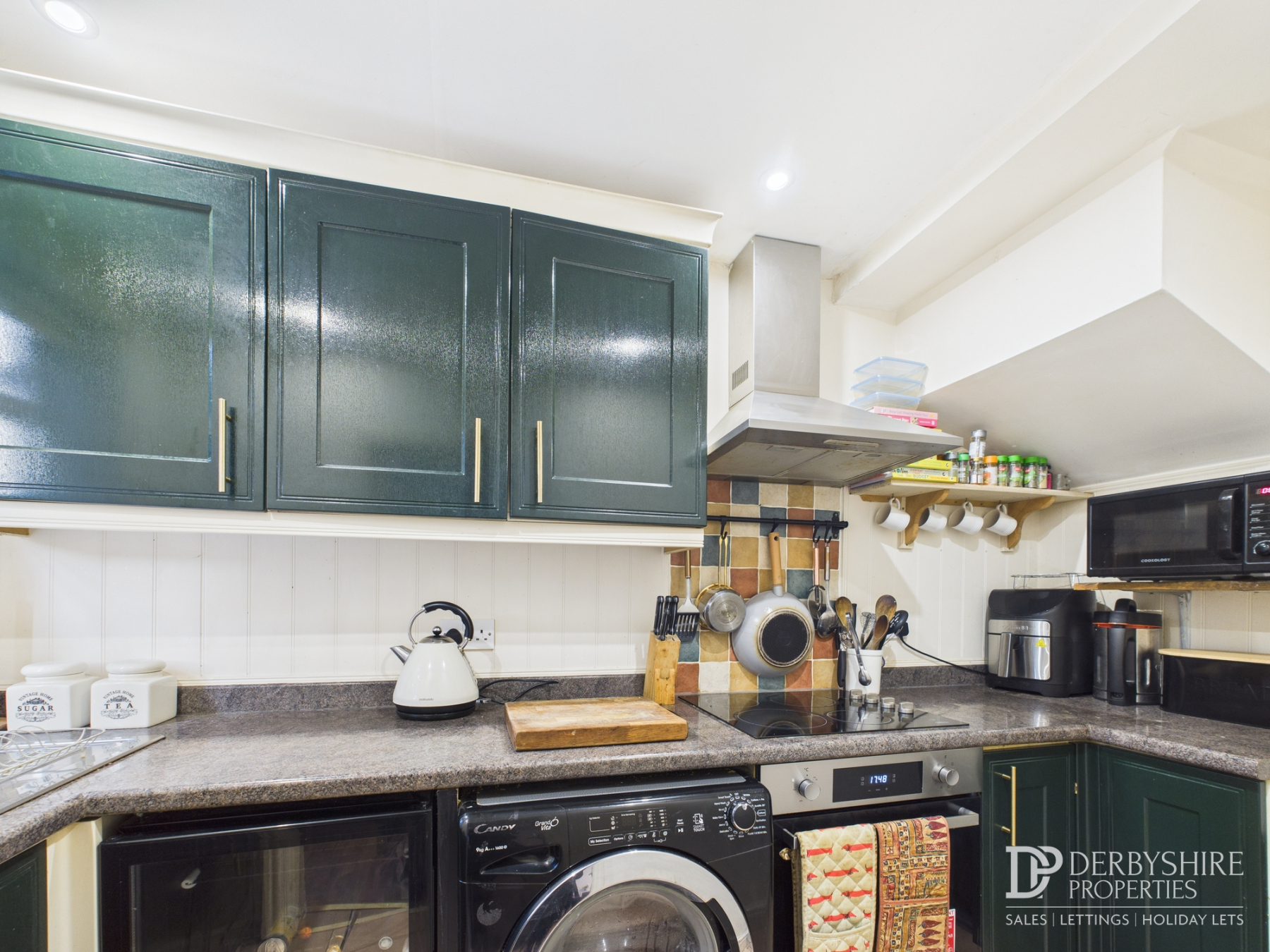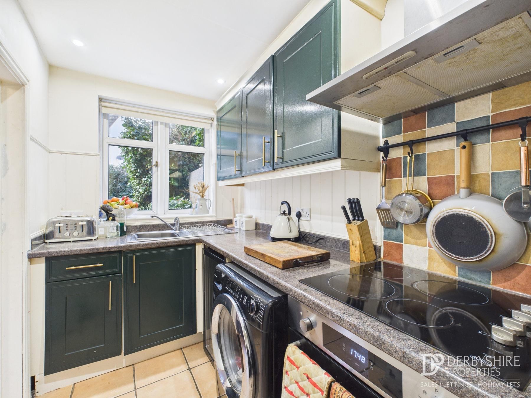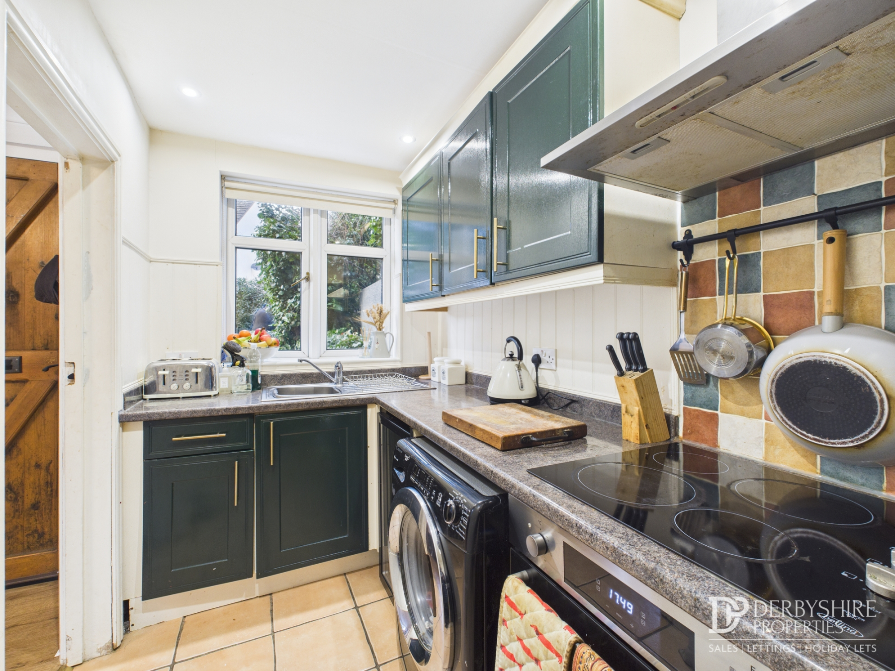 Fitted with a range of wall and base-mounted units with roll-top work surfaces, incorporating a stainless-steel sink and drainer with mixer tap. Appliances include an integrated electric oven, electric hob with stainless-steel extractor canopy, and under-counter space and plumbing for a washing machine. Additional features include under-cupboard lighting, ceiling spotlights, and a double-glazed window to the front elevation.