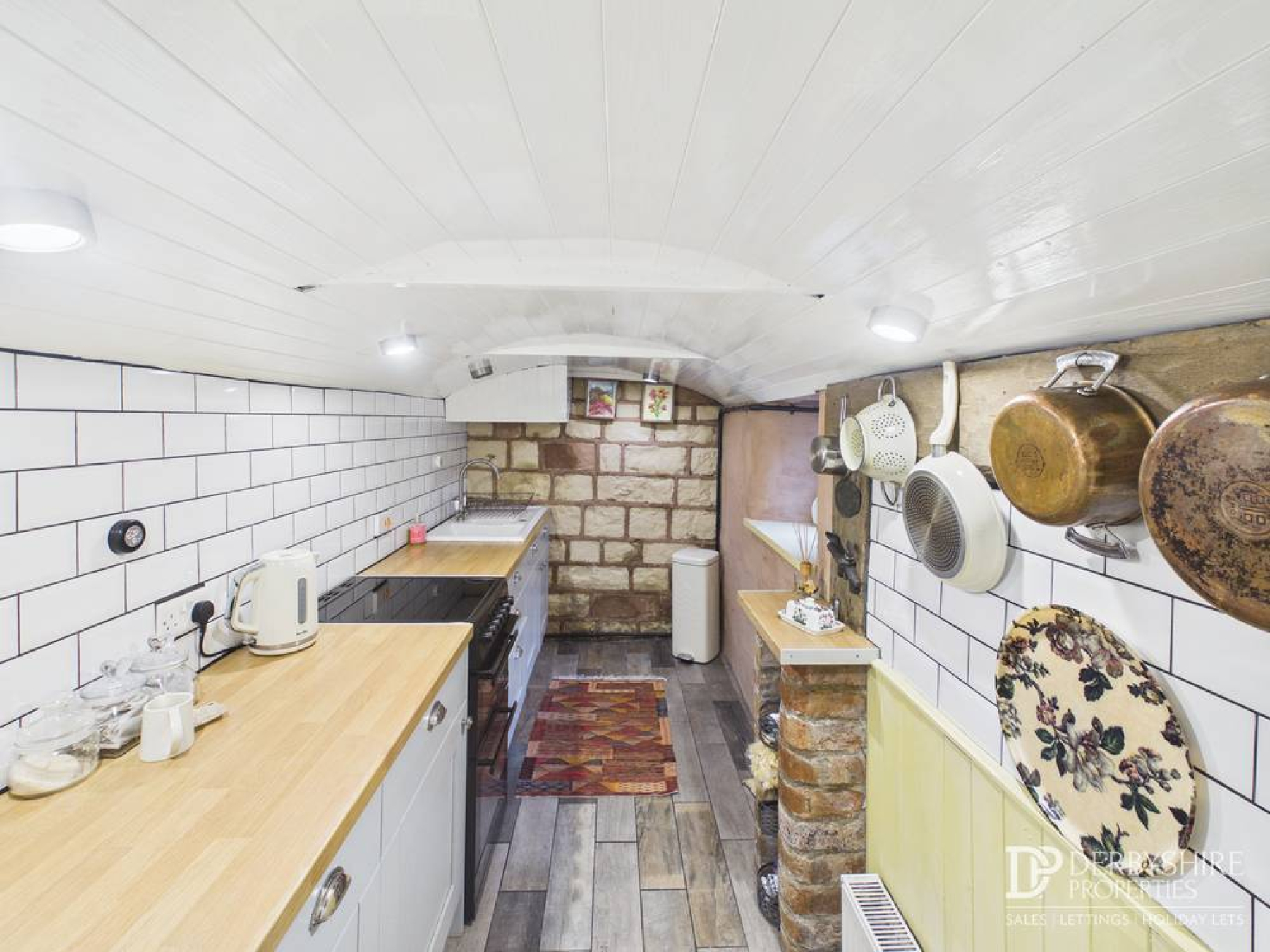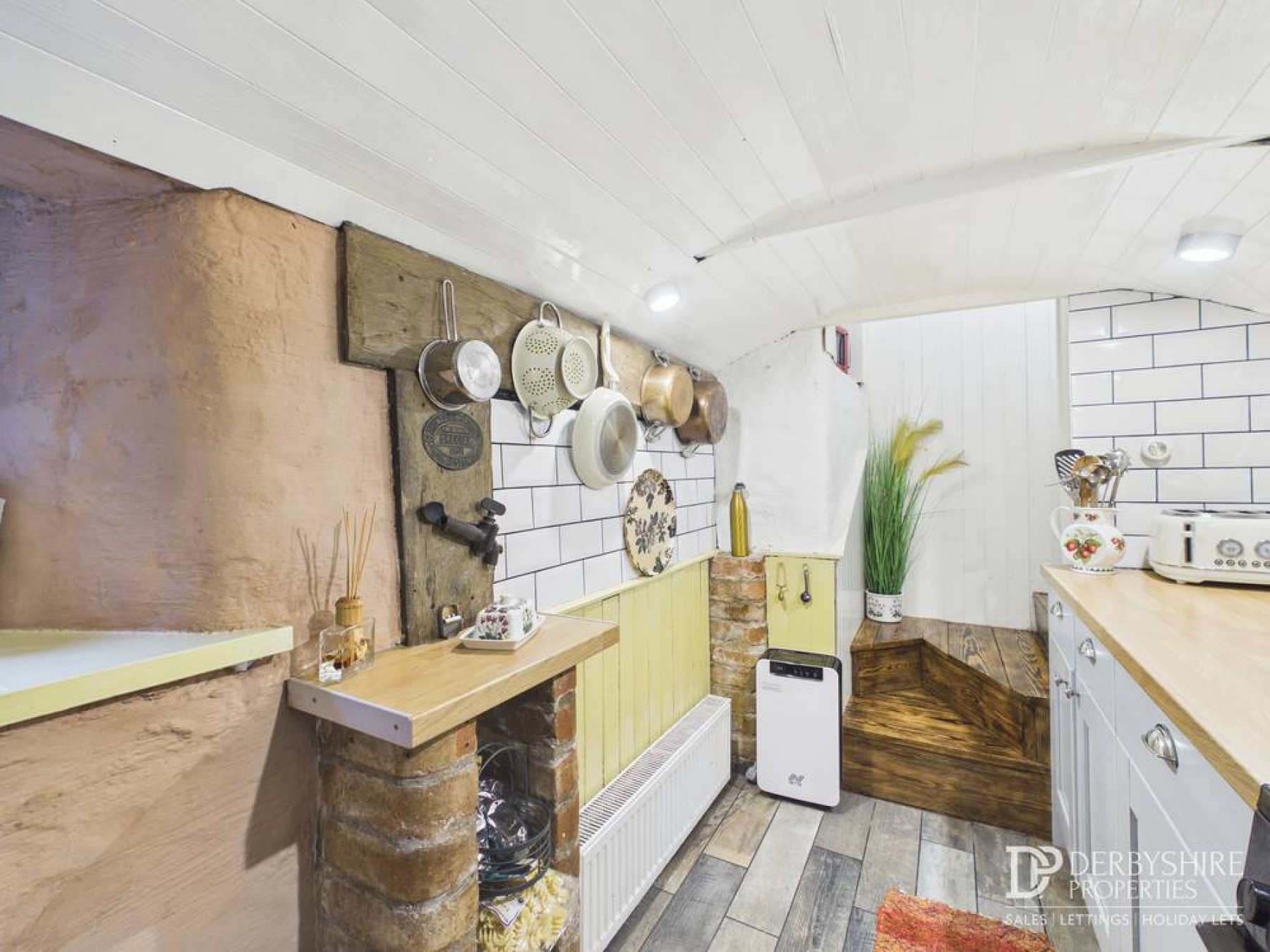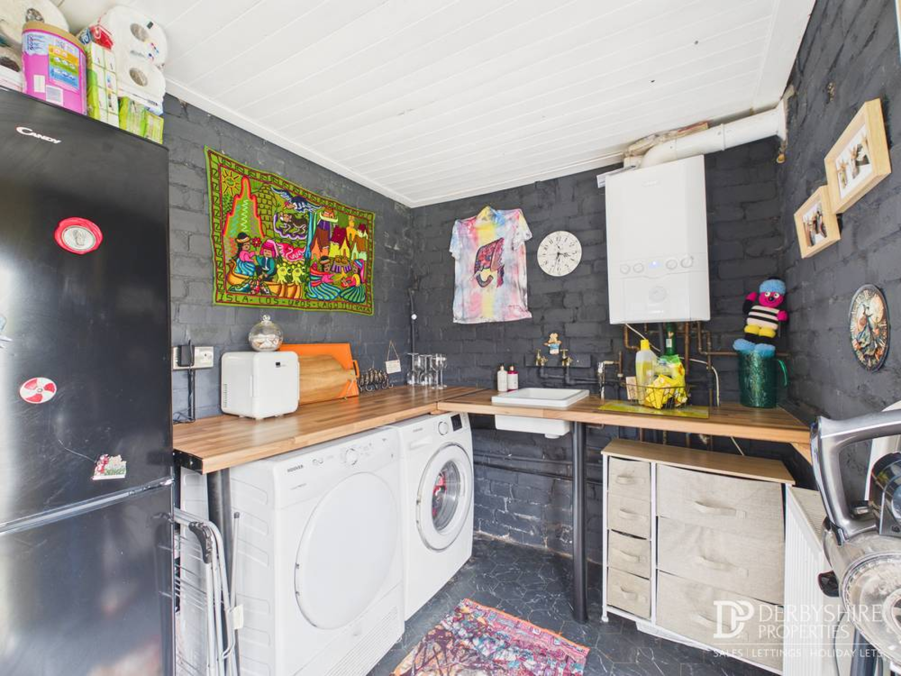 Comprising useful workbenches with under-counter space and plumbing for a washing machine and tumble dryer, wall-mounted radiator, wall-mounted gas combination boiler and tiled flooring. A door leads to the side elevation with window to the rear and a feature vaulted ceiling.