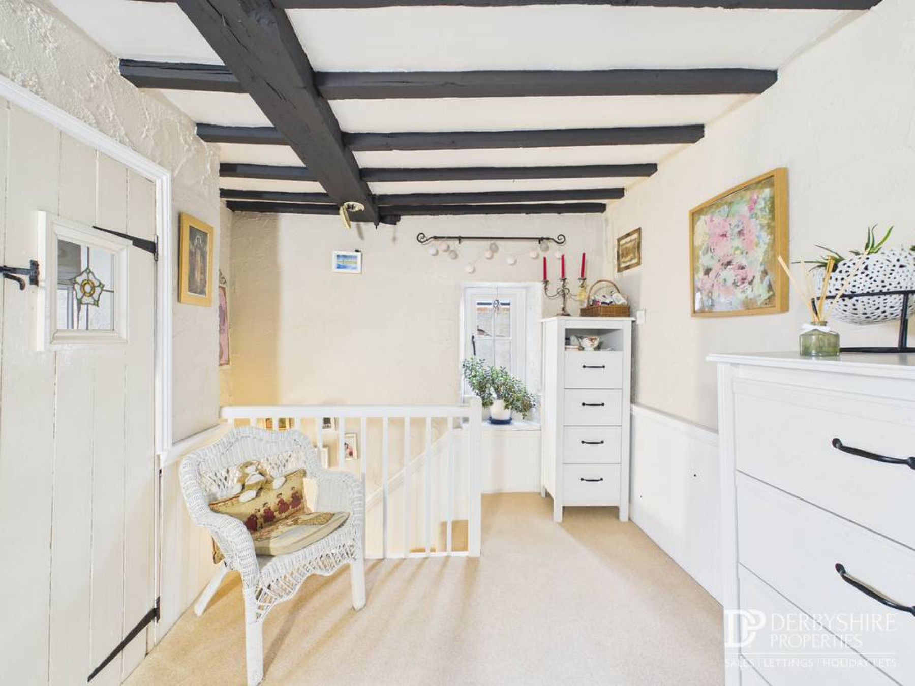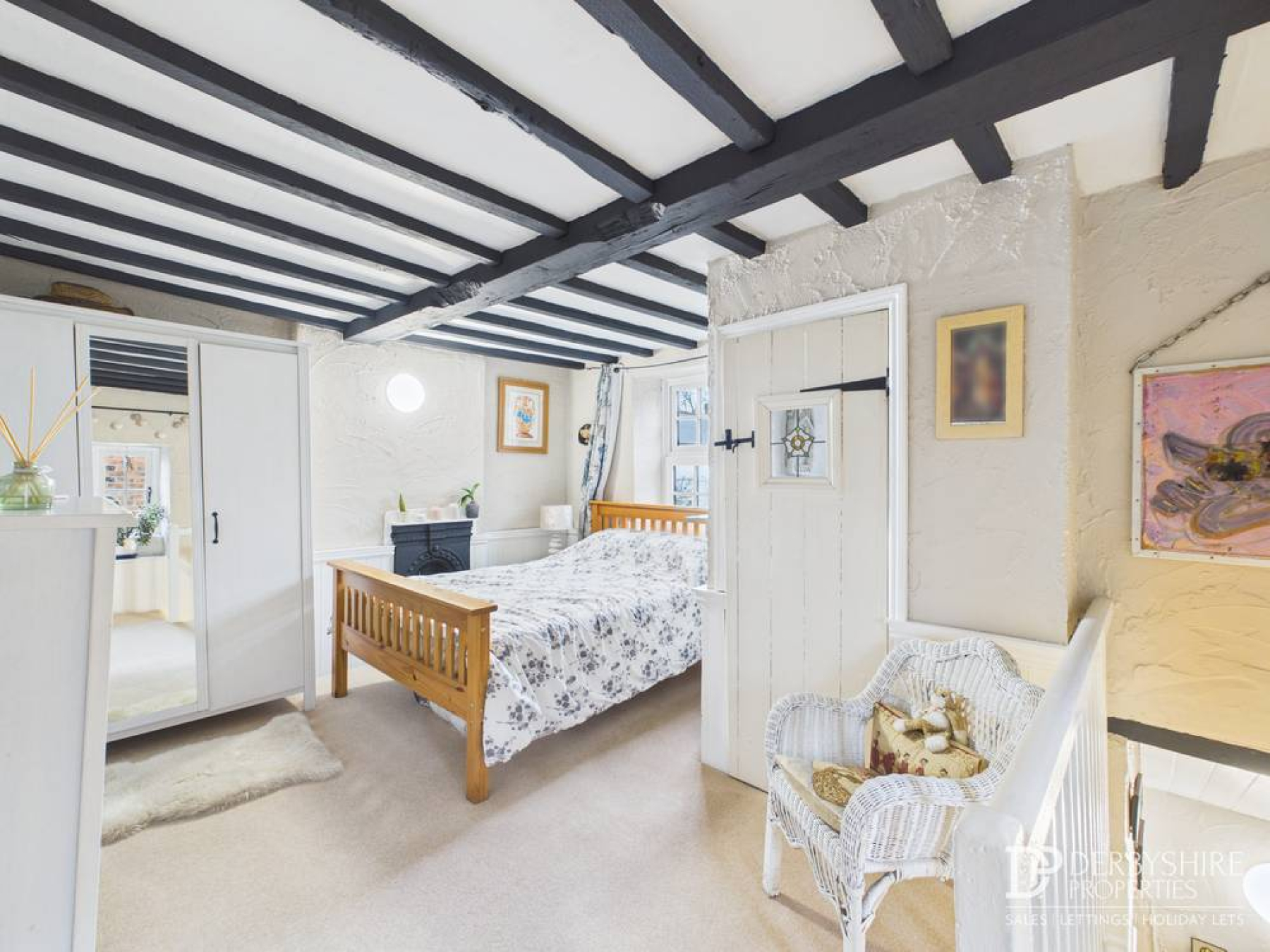 Accessed from the living room is this charming master bedroom featuring a stunning exposed beam ceiling. Double glazed windows to the front and side elevations provide natural light. Additional features include half-height wood panelling, decorative wall lighting and space for bedroom furniture.