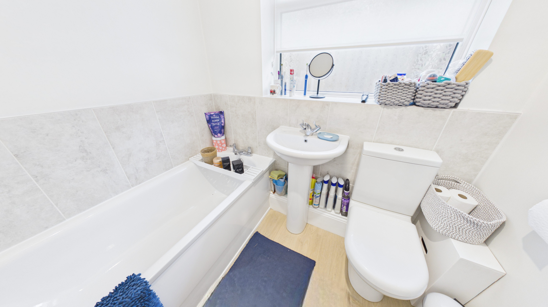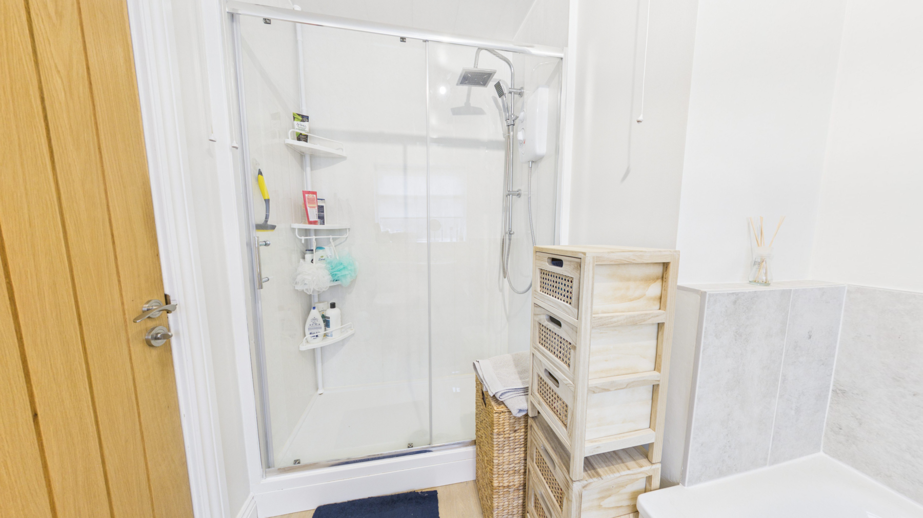 A beautifully presented and modern four-piece suite comprising a WC, pedestal wash hand basin, panelled bath, and a large shower enclosure with wall-mounted electric shower and attachment. Finished with wood flooring, a double-glazed obscured window, wall-mounted chrome heated towel rail, and ceiling-mounted extractor fan.