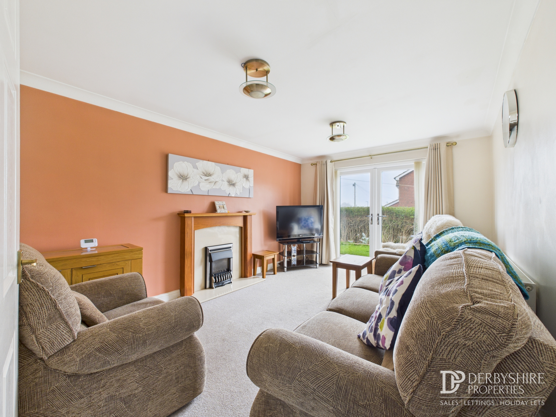 With double glazed French doors to rear elevation, wall mounted radiator and carpeted flooring. The centre piece of the room is gas fireplace on raised hearth set in decorative surround.
