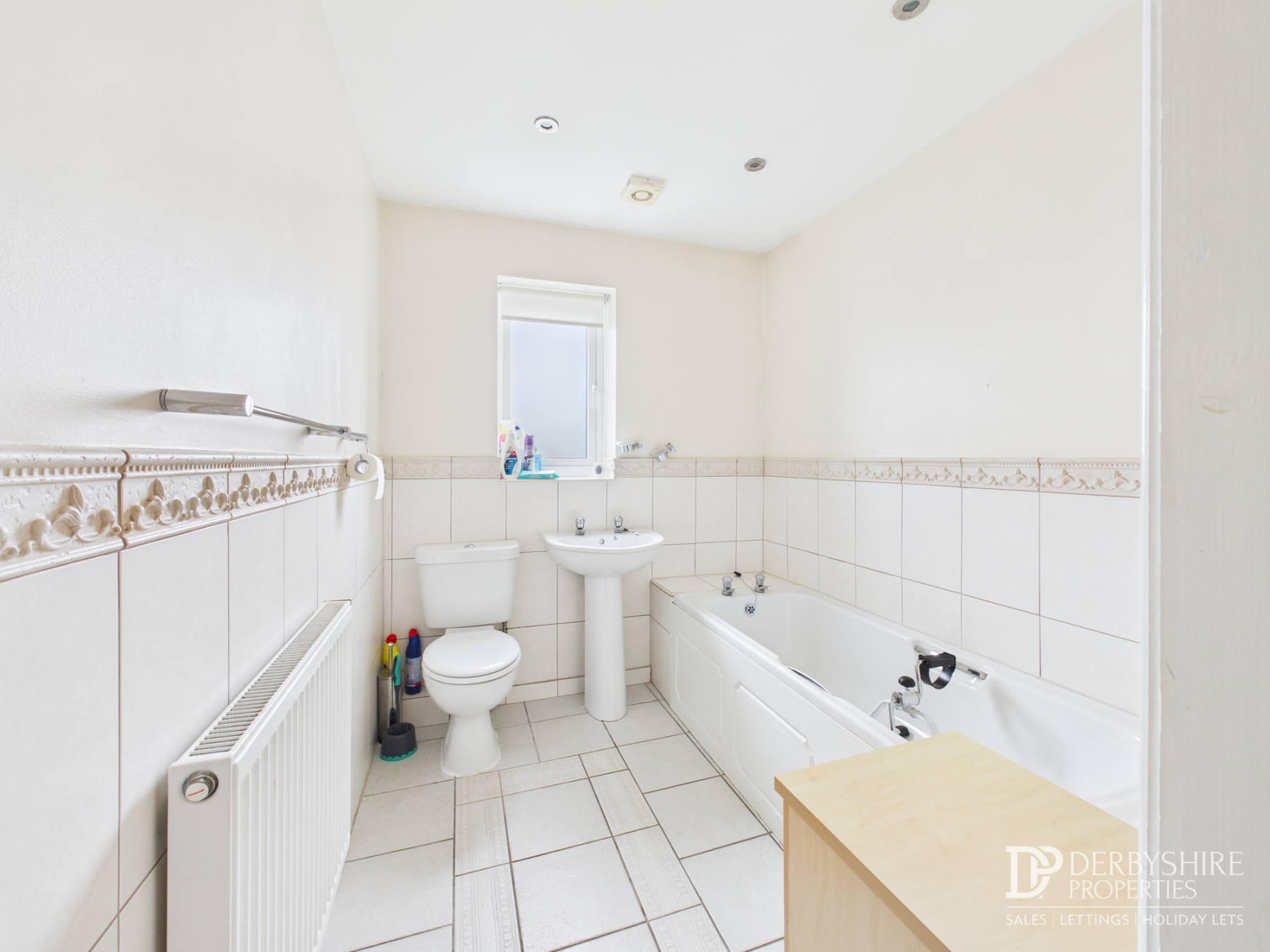 A tiled three piece suite including; Bath, pedestal hand wash basin and low level WC.