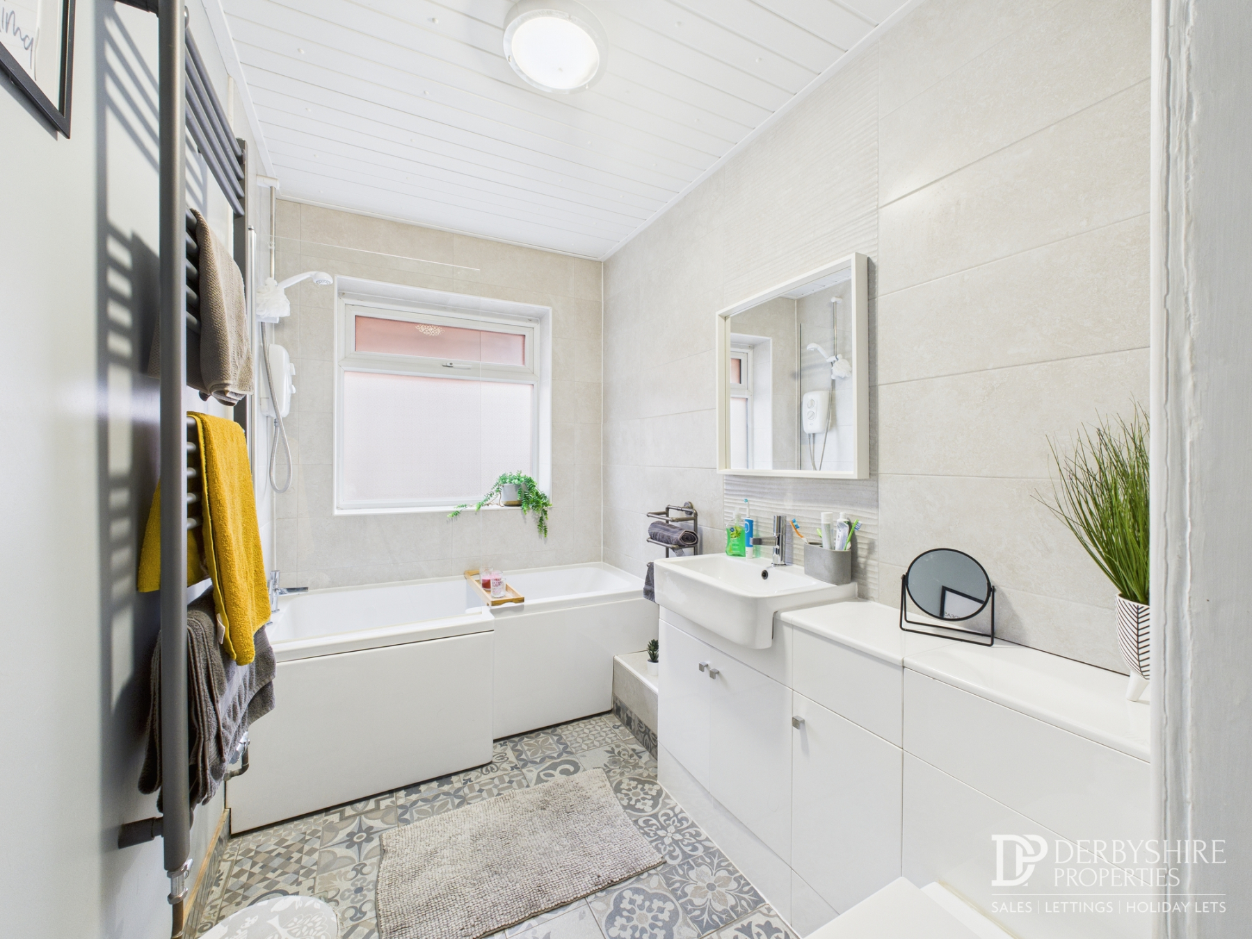 3.26m x 1.68m (10' 8" x 5' 6") A tiled three piece suite including; Bath with shower screen and attachment, vanity handwash basin and low level WC. Wall mounted heated towel rail, tiled flooring and double glazed obscured window to side elevation completes the space.