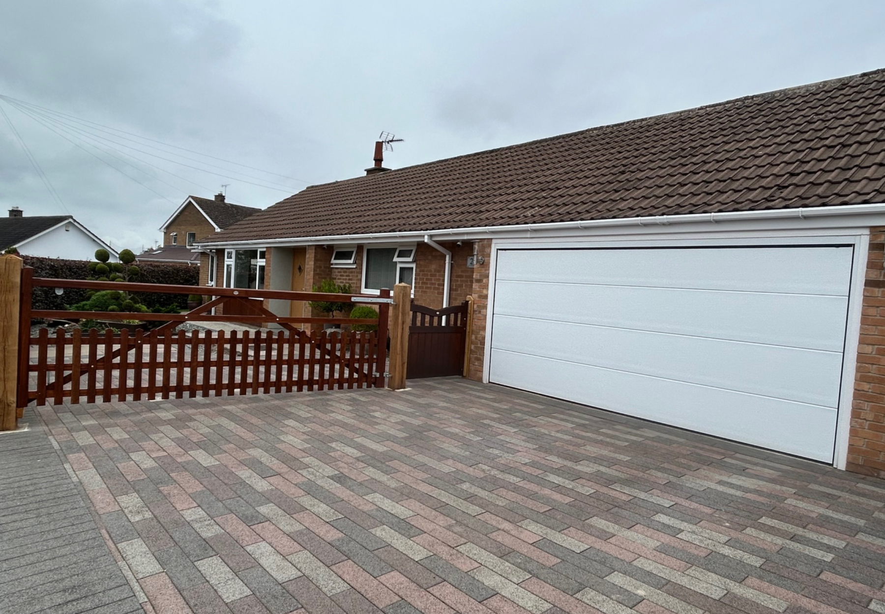 To the front elevation is a beautifully constructed contrasting paved patio with decorative gravel borders, lawn, hedgerow boundaries and outside lighting. A superb block paved driveway provides parking for 2–3 vehicles and leads to a double integral garage with electric roller door. To the side is a caravan storage area enclosed by timber fencing.