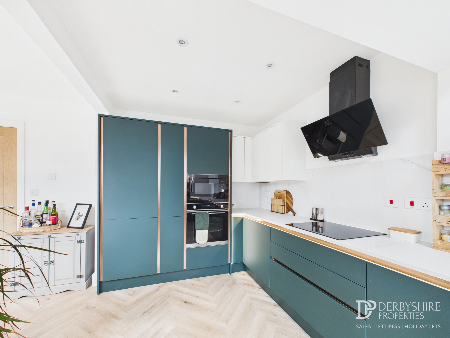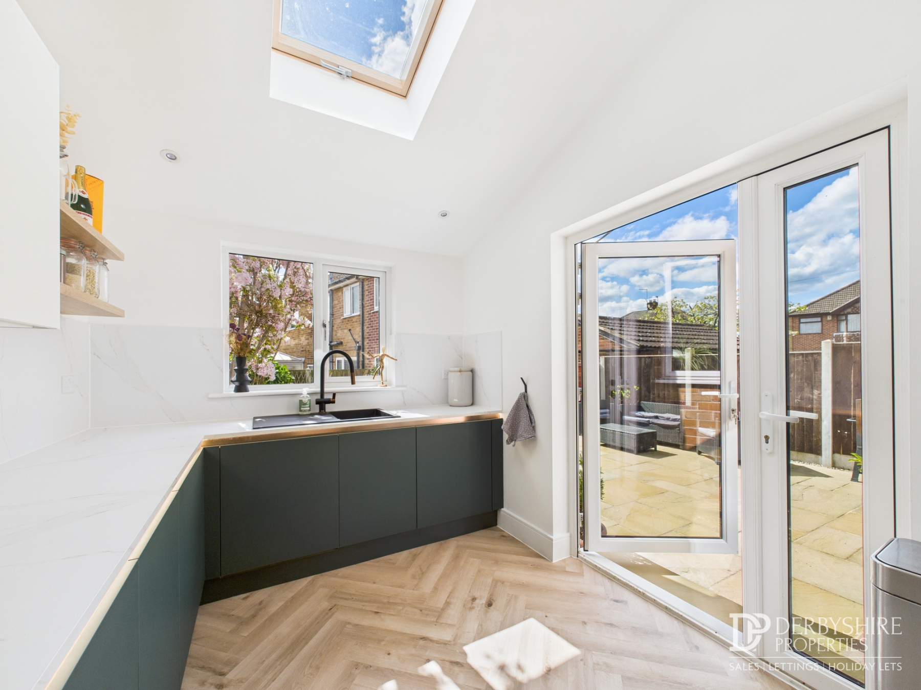 With double glazed windows and doors to the rear and side elevations providing high levels of natural light. The beautifully designed kitchen incorporates numerous wall and base mounted contrasting storage cupboards incorporating a single sink drain unit with mixer taps. Numerous appliances to include fridge/freezer, electric oven, convection microwave oven, induction hob with modern extractor over, dishwasher and washing machine. Spotlighting to ceiling, Velux window, LTV floor covering and wall mounted radiator.
