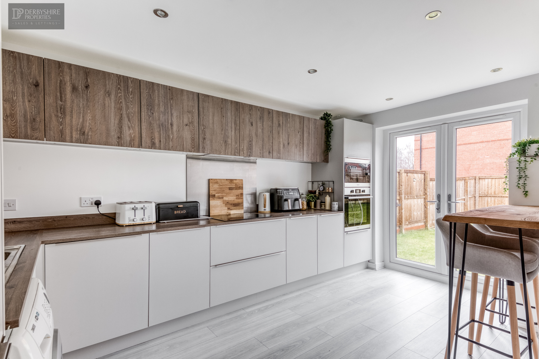 14' 0" x 8' 6" (4.27m x 2.59m) Featuring a range of base cupboard and eye level units with complimentary wood effect worktops allowing for the integration of appliances such as; Fitted oven and microwave, Hotpoint electric hob with accompanying extractor hood, fitted fridge freezer and inset stainless steel one and a half bowl sink. Under unit lighting, under counter plumbing, wall mounted radiator and double glazed French doors accessing rear enclosed garden complete the space.