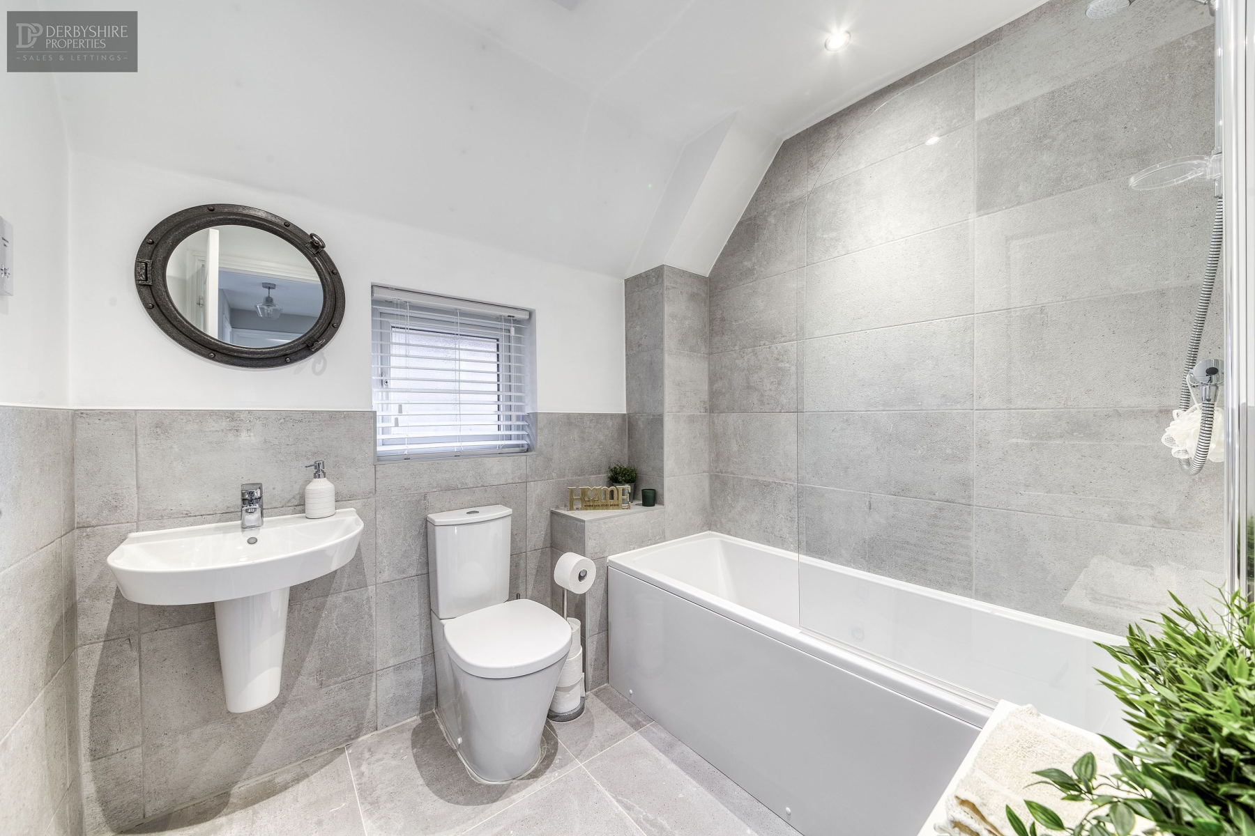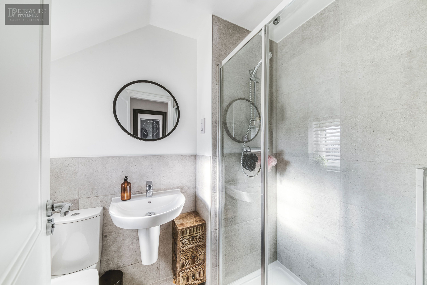 Comprising of a three-piece suite to include WC, wall mounted wash handbasin and large shower enclosure with mains fed shower and attachment over. Spotlights and extractor fan to ceiling, attractive tiling, double glazed obscured window, wall mounted chrome heater towel rail and tiled floor covering.