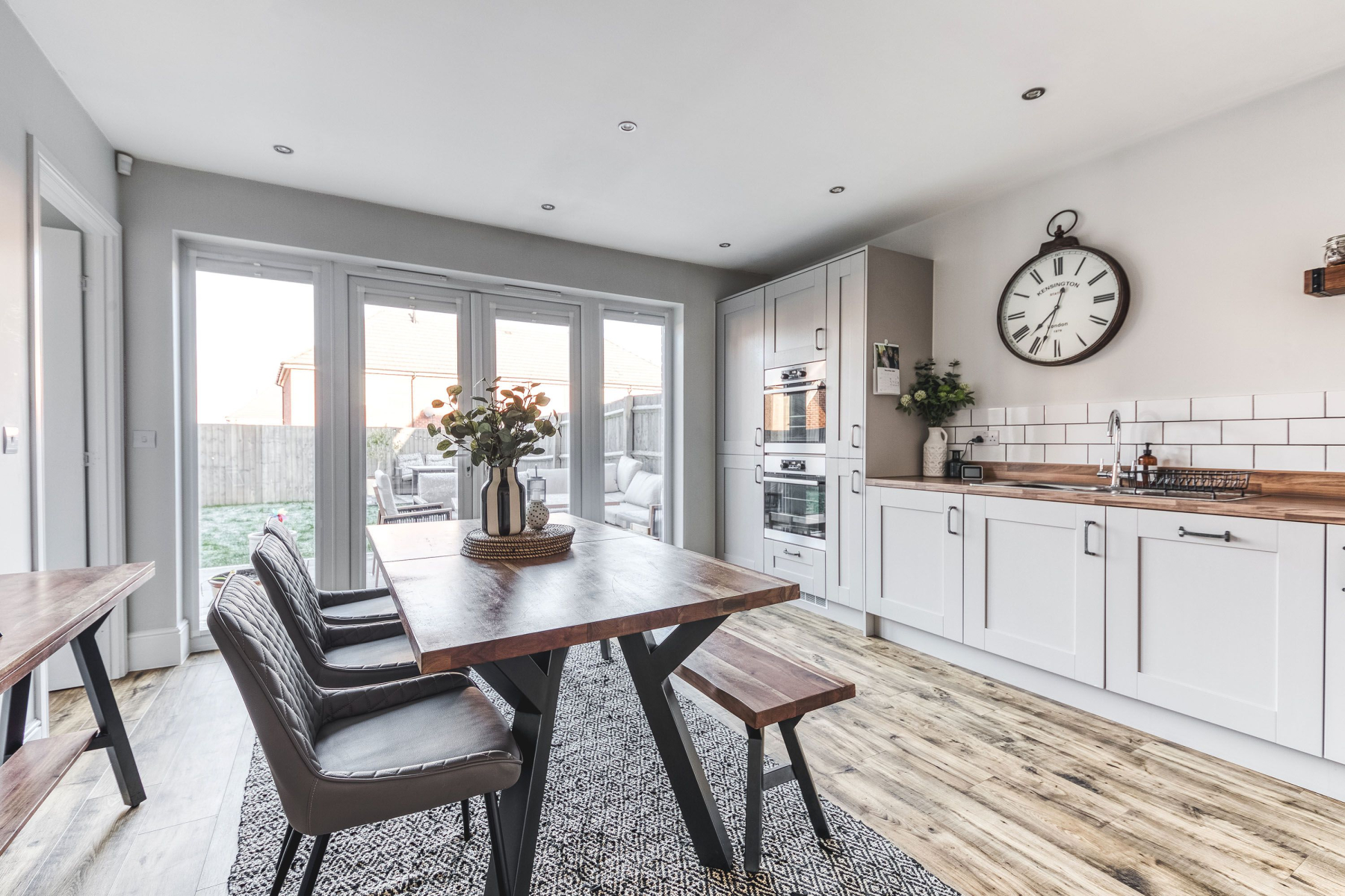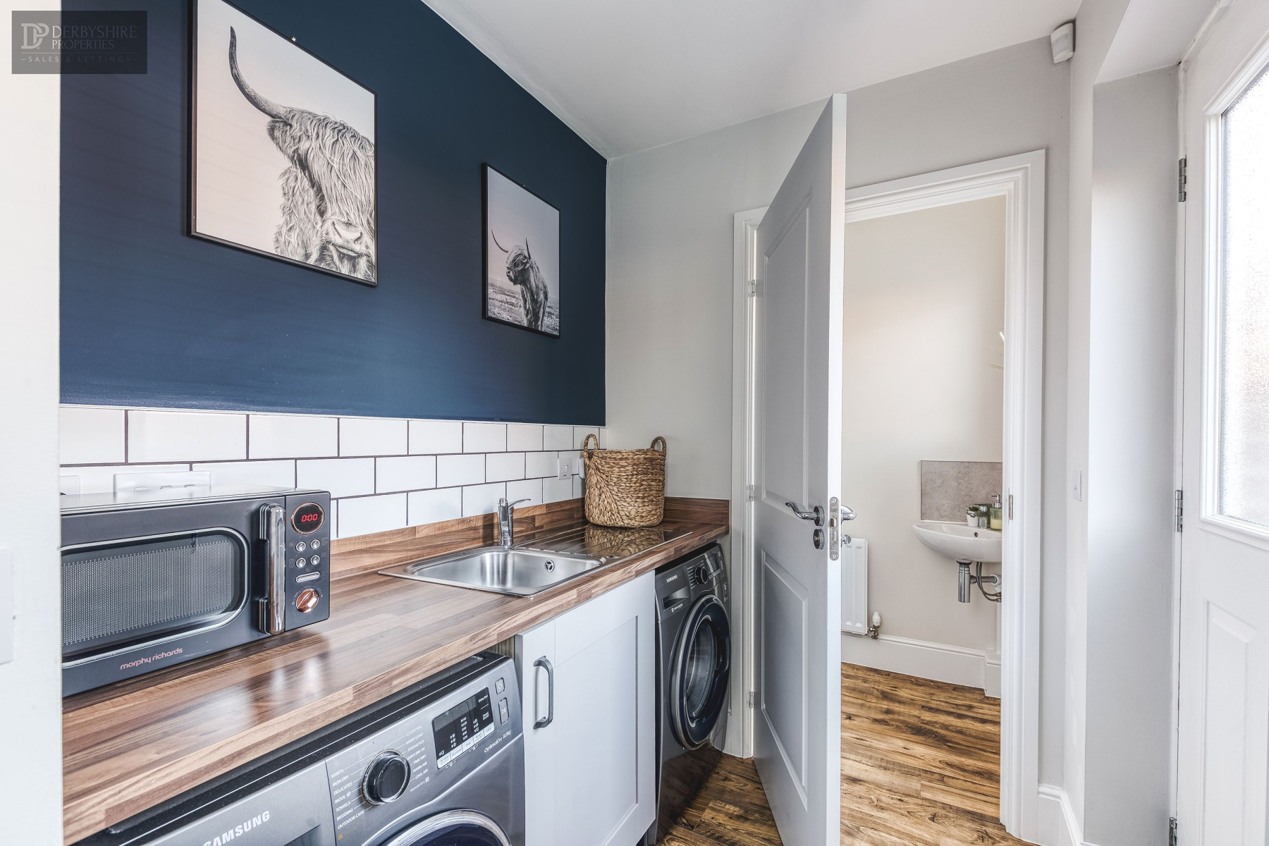 With the continuation of the kitchen units with modern flat edged worksurface incorporating a single stainless steel sink drain unit with heritage tile splashback. Undercounter space and plumbing for both washing machine and tumble dryer, composite door to the rear elevation and internal door accessing:-
