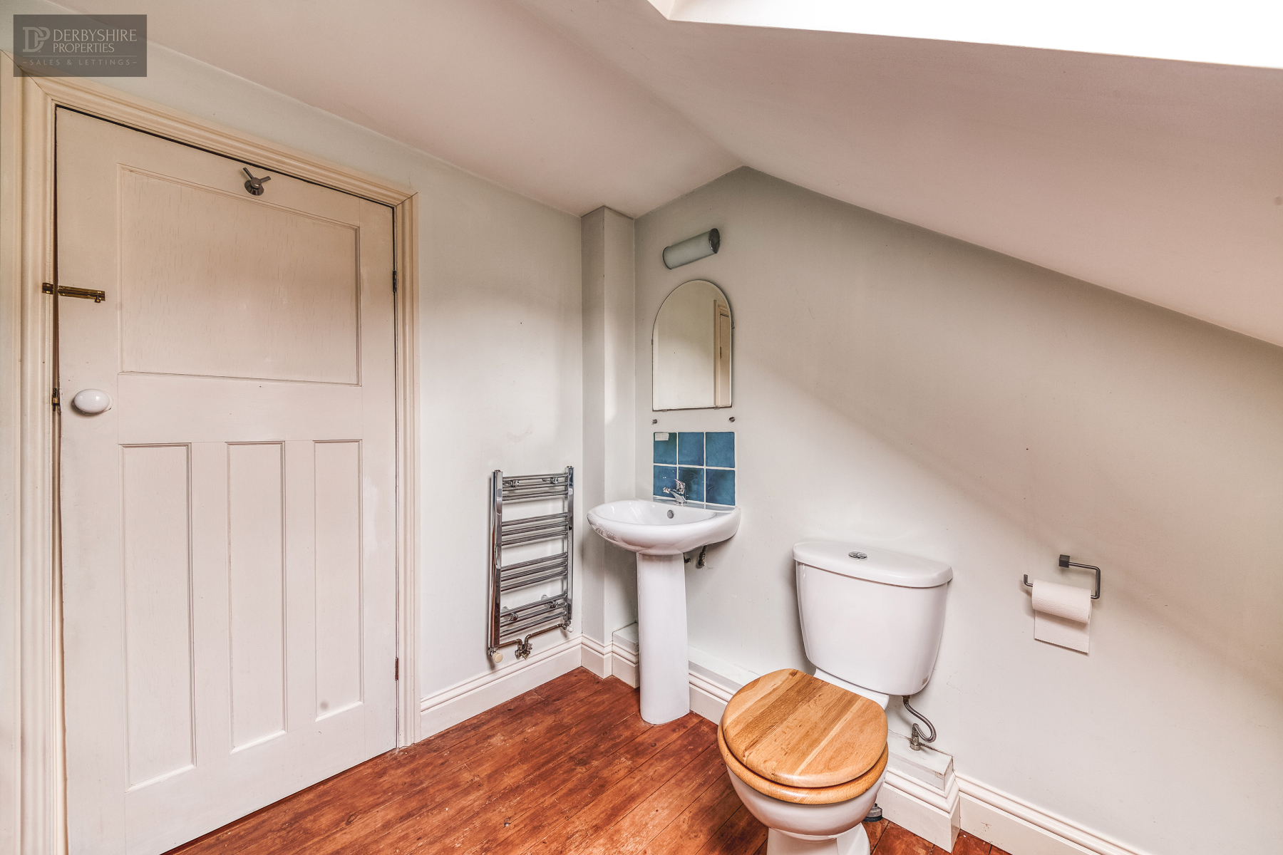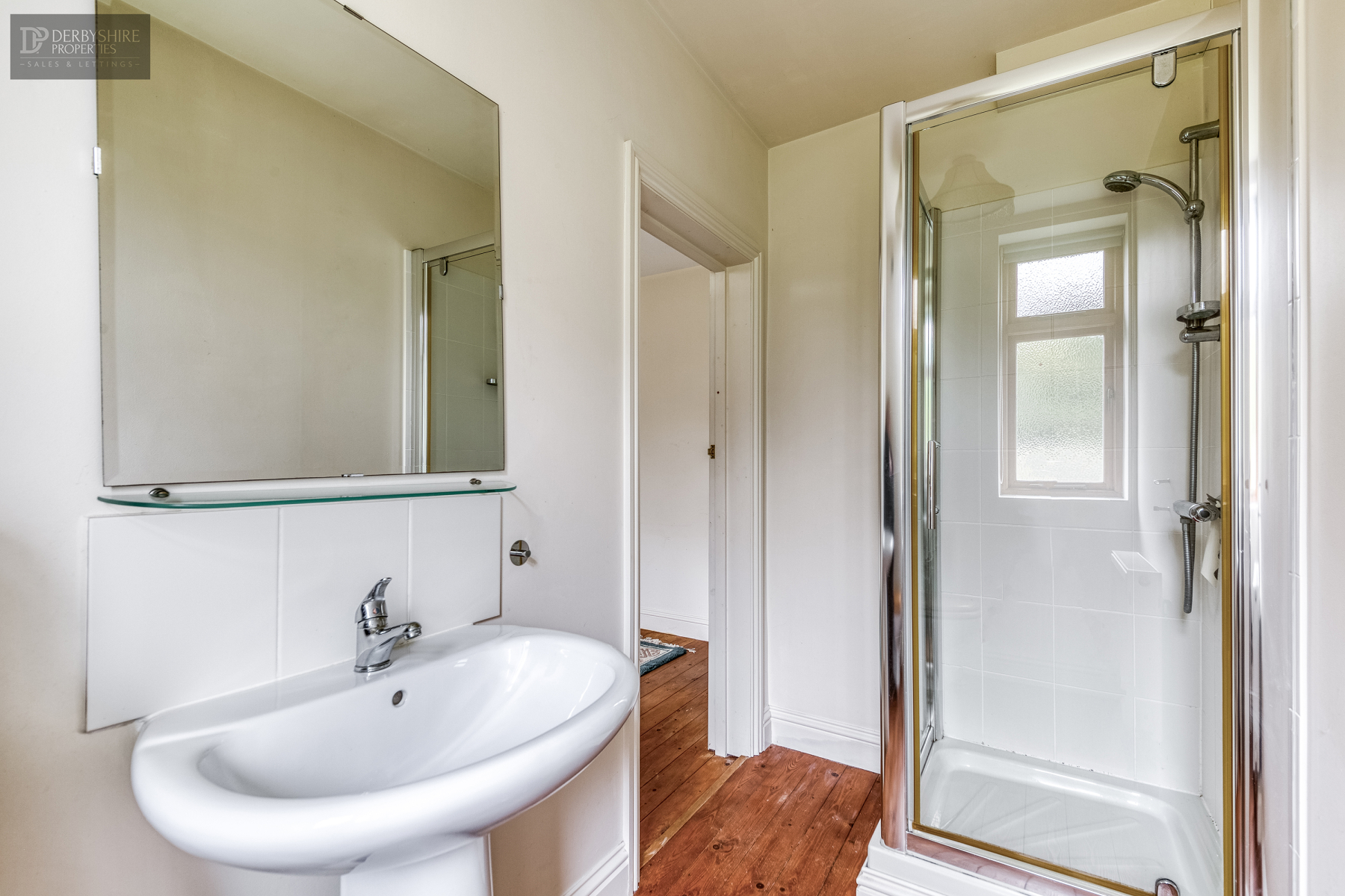 With separate shower cubicle with shower, pedestal wash hand basin, low level WC, deep skirting boards and architraves, high ceiling, exposed wood floors, radiator, extractor fan, sealed unit double glazed obscure window and internal panelled door.