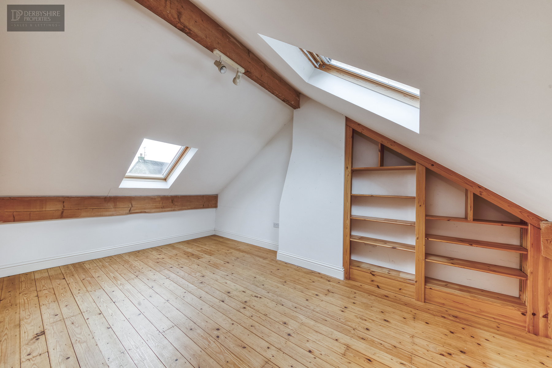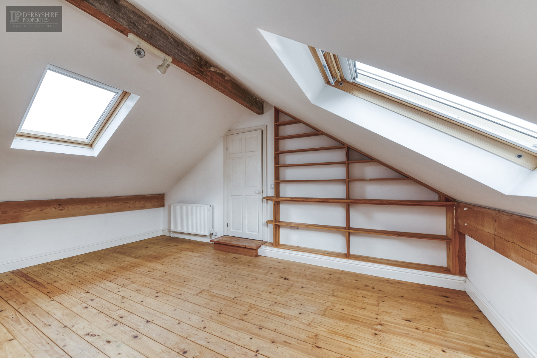 With principle beam to ceiling, chimney breast, exposed wood flooring, fitted pine shelving, additional pine beams, radiator, double glazed Velux style window to rear, double glazed Velux style window to front, far reaching countryside views including views towards the charming old windmill and internal panelled door.