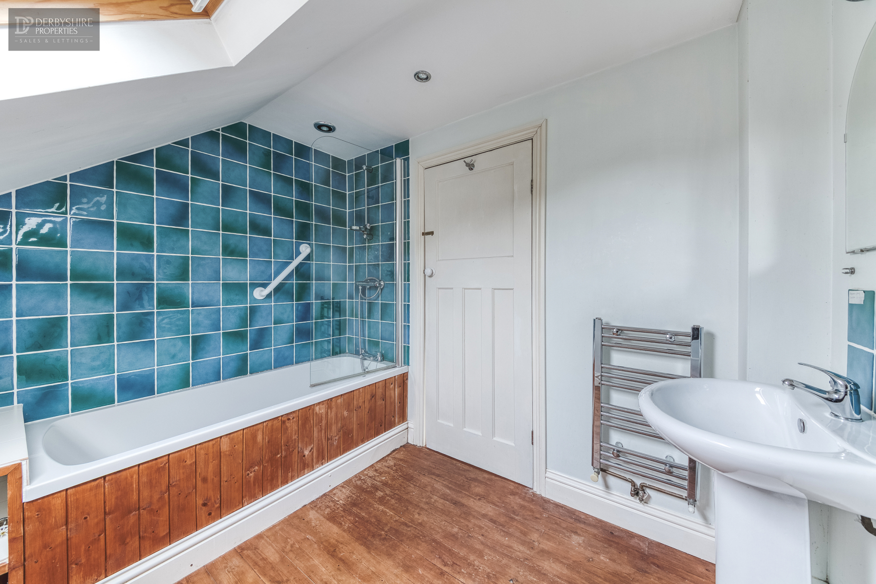 With bath with shower over with shower screen door, pedestal wash hand basin low level WC, tiled splashbacks, exposed wood floors, chrome towel/radiator, spotlights to ceiling, storage into eaves, double glazed Velux style window with fitted blind and internal panelled door.