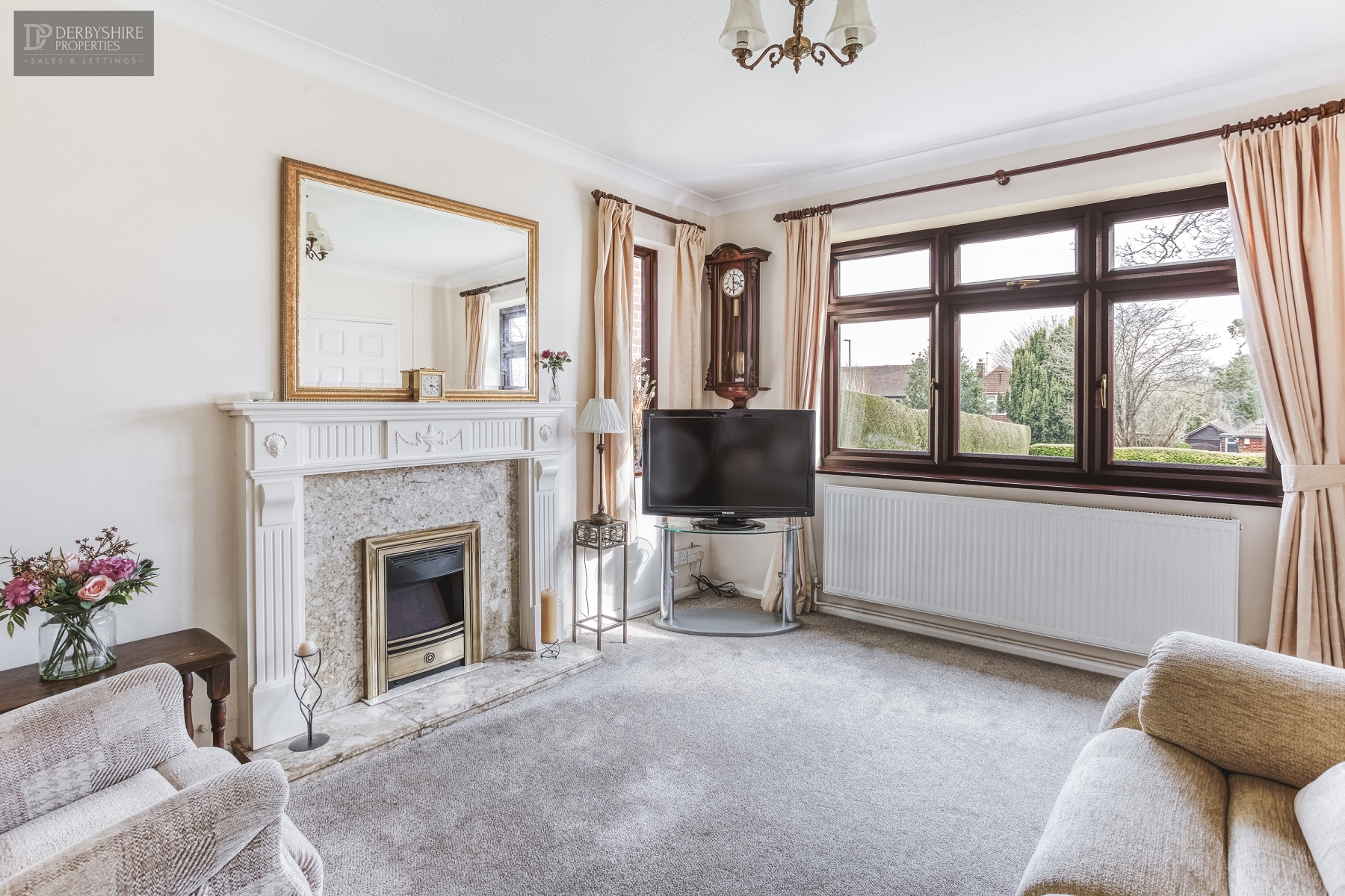With double glazed window to the front and side elevations, wall mounted radiator and TV point. The focal point of the room is a wall mounted gas fire with decorative surround, marble backdrop and raised hearth.