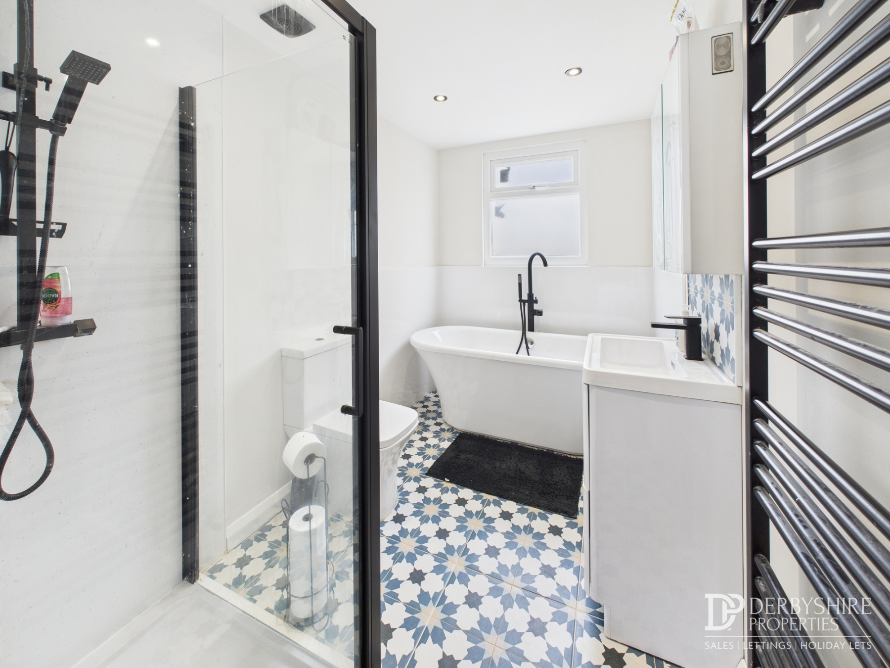 3.08m x 1.78m (10' 1" x 5' 10") This beautifully presented, contemporary bathroom features a sleek low-level WC, a large vanity unit with tile splashback, and a modern freestanding bath complete with mains-fed taps and shower attachments. A separate shower enclosure houses a mains-fed shower with handheld attachment. Additional highlights include part-tiled walls, a chrome wall-mounted heated towel rail, spotlights, an extractor fan, and a stylish tiled floor. A double-glazed obscured window provides natural light while maintaining privacy.