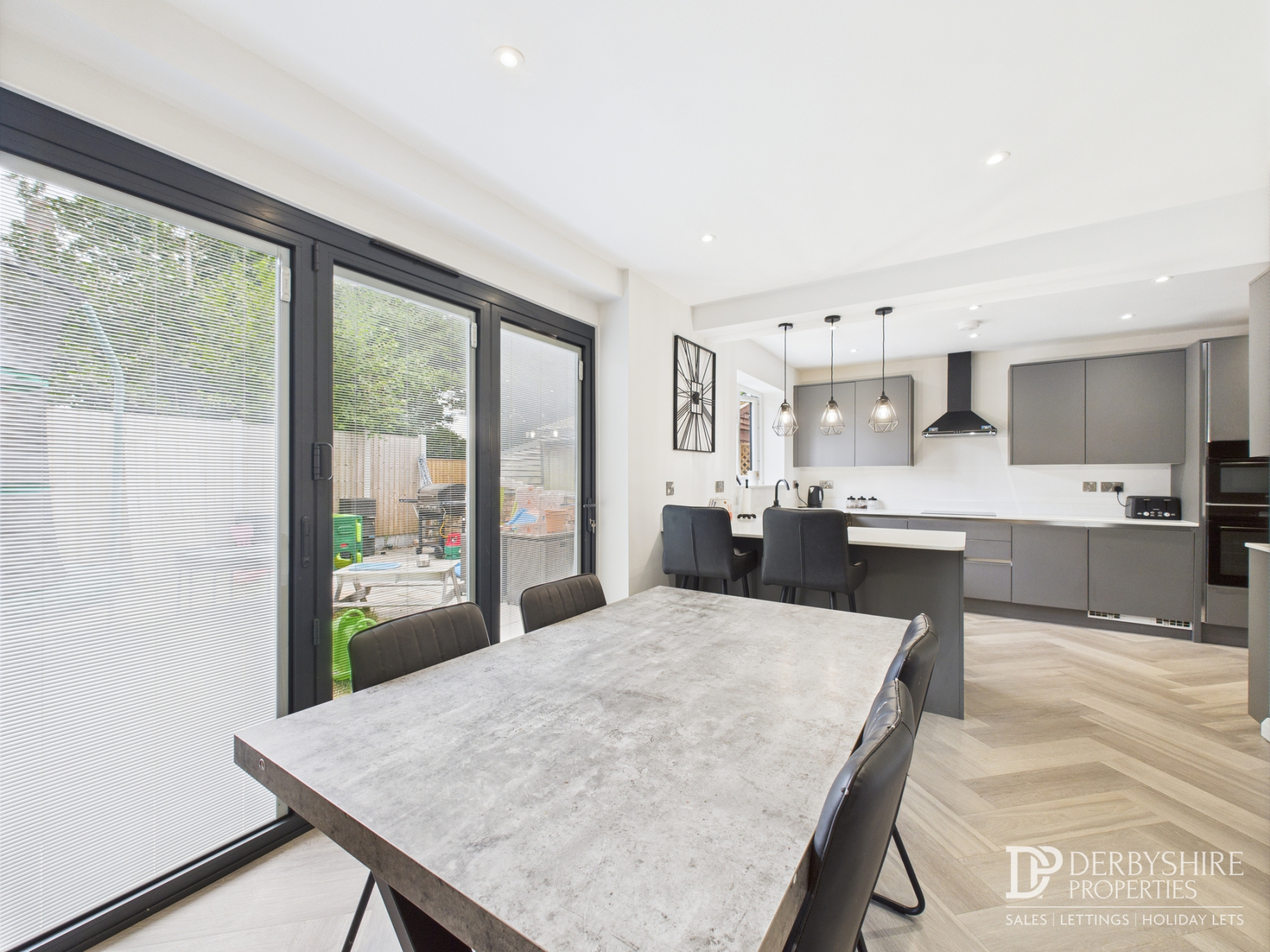 The dining area features stylish LVT flooring and ceiling spotlights, creating a bright and inviting space. Bi-fold doors seamlessly connect the room to the rear garden, allowing for plenty of natural light and easy indoor-outdoor living.
