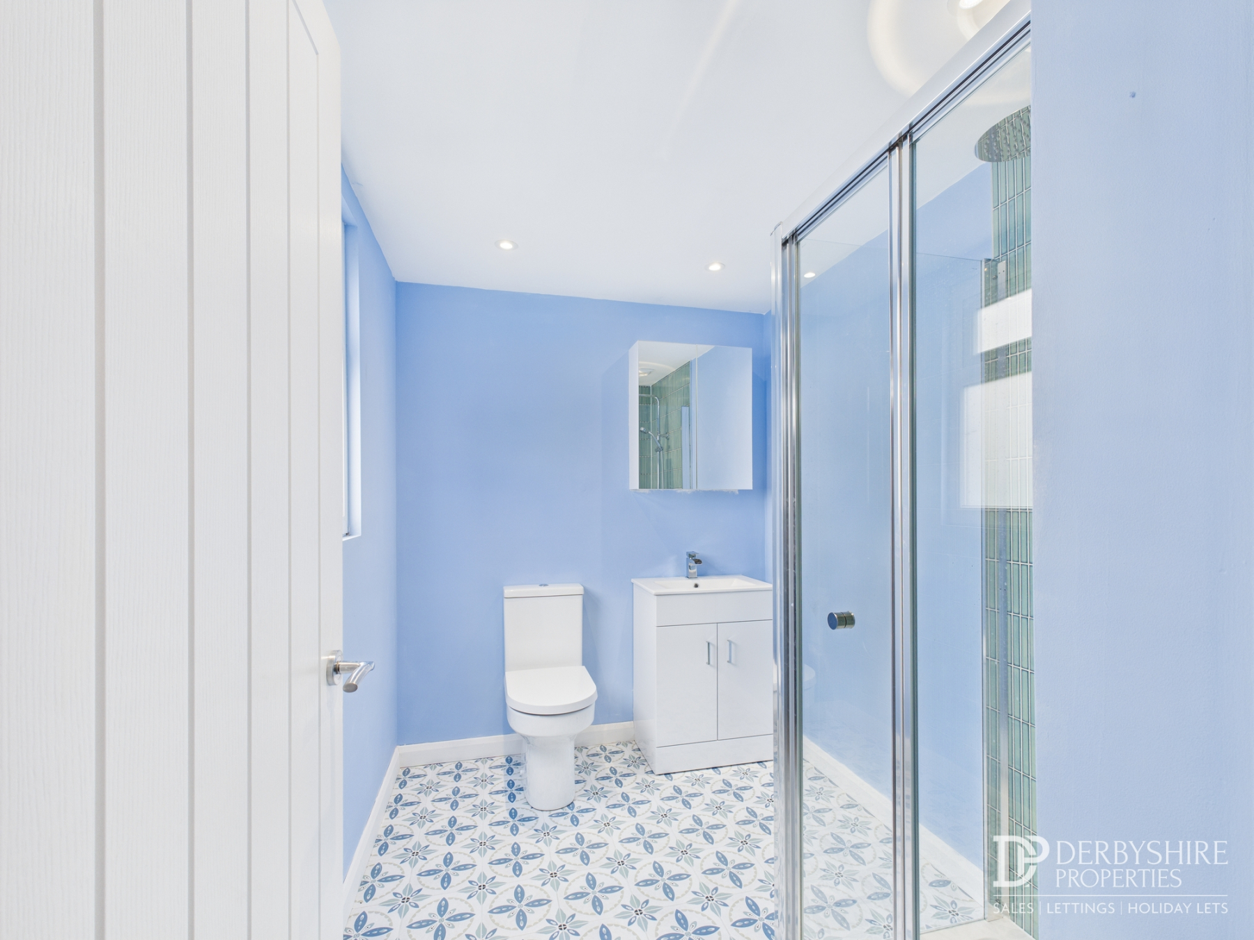 A newly re-fitted shower room, with tiled flooring, tiled shower enclosure, spot lighting to the ceiling and an obscured window to the side elevation.