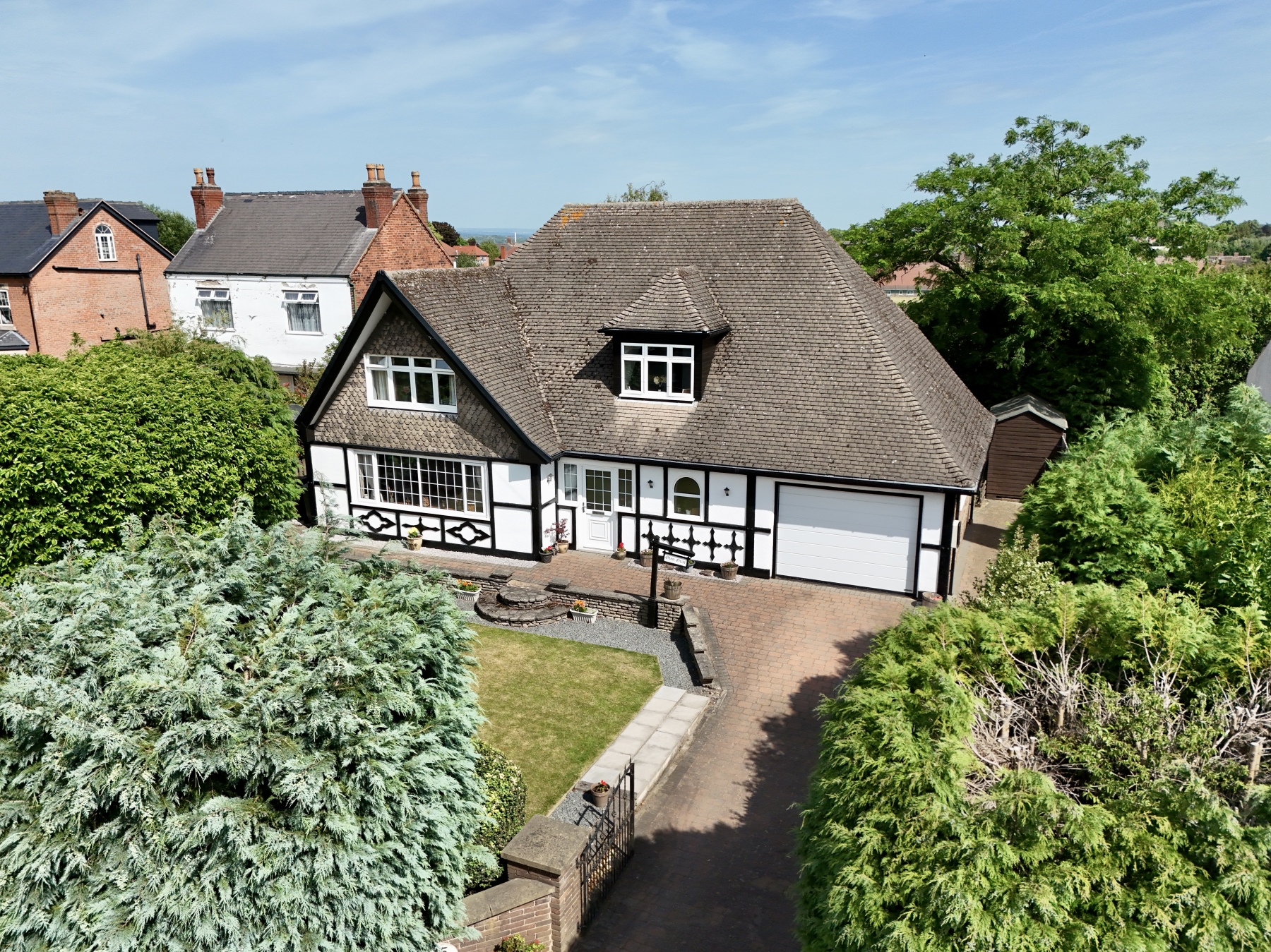 To the front elevation, you are greeted by block paved driveway fit to house multiple vehicles leading to integral garage accessed via steel roller door. The front garden is laid to lawn and bordered by mature hedge rows and trees allowing for privacy. The rear garden is a fantastic space for hosting or relaxing with raised entertaining patios leading to lawned space occupied by mature flower beds and fishpond. Open field aspect features to the rear elevation entire as the space is bordered by a combination of timber fencing and mature shrubbery making it ideal for those with pets and young children.