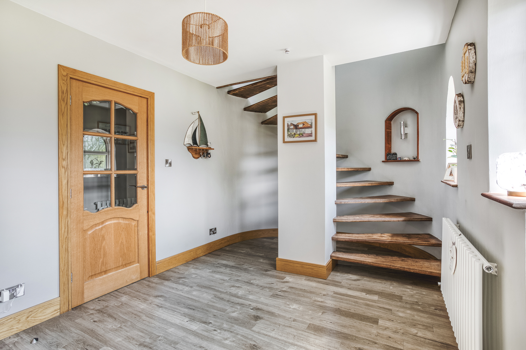 Accessed via UPVC door to front elevation, this light and welcoming space boasts double glazed window to front elevation, wall mounted radiator and wood effect flooring. Internal French doors open to Lounge whilst wooden spiralled staircase rises to the first floor.