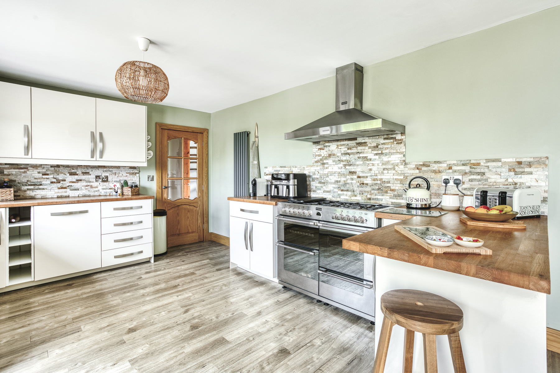 7.05m x 3.58m (23' 2" x 11' 9") A fantastic open plan Dining Kitchen, perfect for hosting or relaxing. The Kitchen features a range of base cupboards and eye level units with integrated wine racks as complimentary wood effect worktops over house inset double Belfast sink. Decorative splashback covers the workspace whilst free standing cooker with seven ring hob and four separate cooking compartments is located beneath stainless steel extractor hood. Two wall mounted radiators feature whilst UPVC double glazed door accesses rear elevation. Wood effect flooring extends to the Dining space where double glazed sliding doors access the Conservatory.