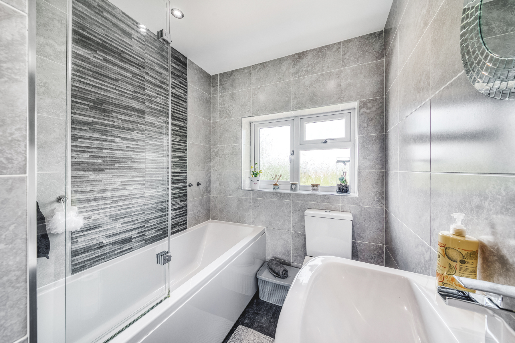 A tiled three piece suite comprising; Bath with shower screen and attachment, pedestal handwash basin and low level WC. Wall mounted radiator and double glazed window to rear elevation complete the space.