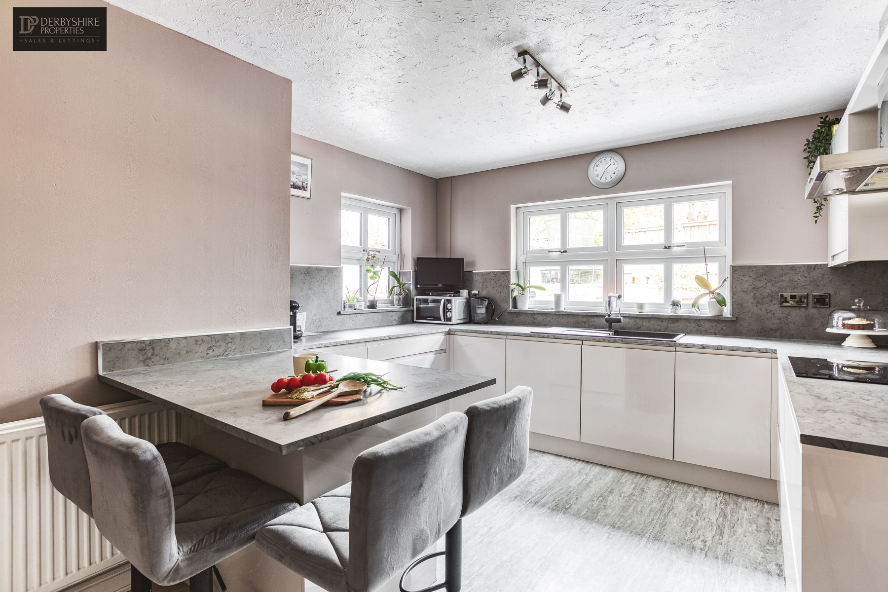 3.45m x 4.14m (11' 4" x 13' 7") This beautifully presented modern kitchen comprises of range of matching wall and base mounted units with modern flat edge worksurfaces incorporating a sink drainer unit with mixer taps. Integrated appliances include dishwasher, fridge/freezer, ceramic hob, stainless steel extractor canopy, electric fan assisted oven. Modern LVT floor covering, feature breakfast bar with seating space and storage, undercounter and cupboard lighting, double glazed windows to the rear and side elevations.