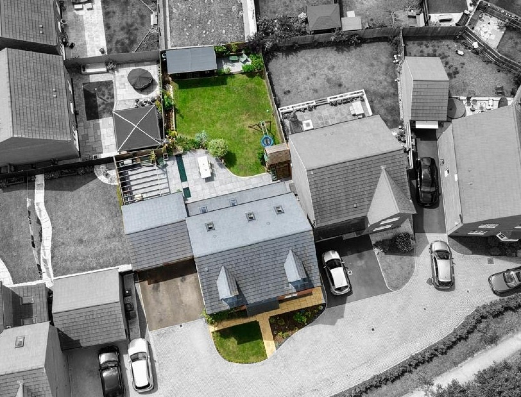 The majority of the garden is laid to lawn, bordered by meticulously tended flowerbeds and contemporary structures that add visual interest throughout. A further paved patio area and a detached timber summerhouse provide additional outdoor living space.