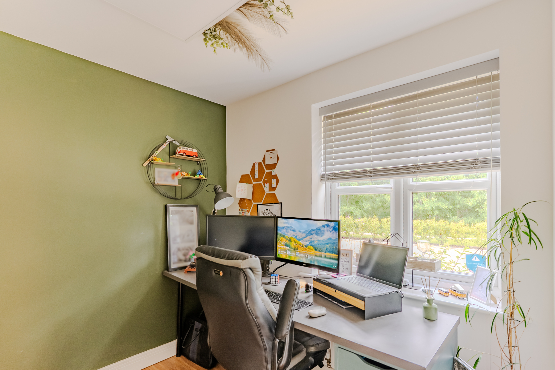 2.38m x 2.32m (7' 10" x 7' 7") A well-proportioned home office featuring a double-glazed window to the front elevation, allowing for plenty of natural light. Finished with a stylish wood floor covering and a wall-mounted radiator, this space is ideal for remote working or quiet study.