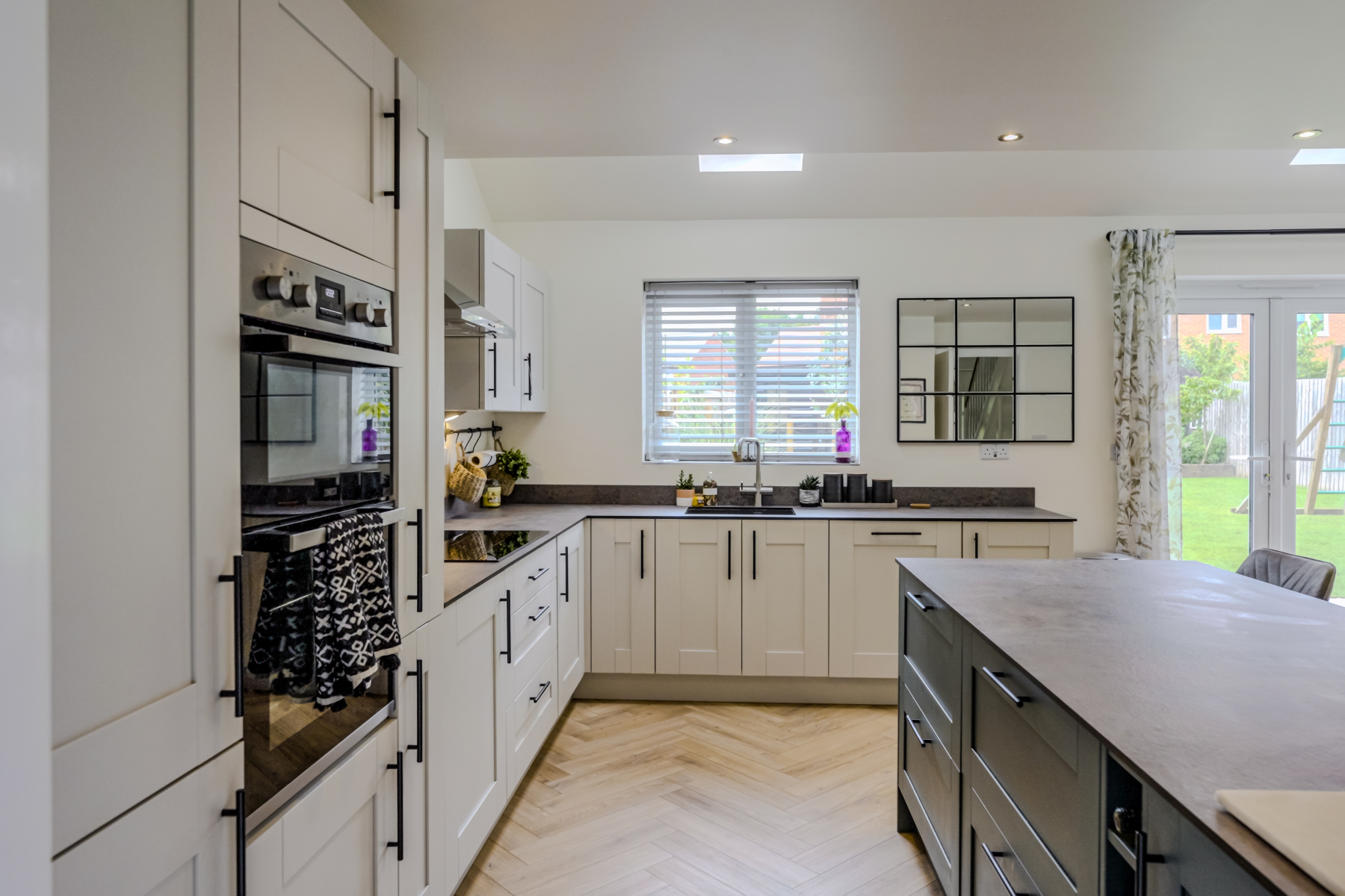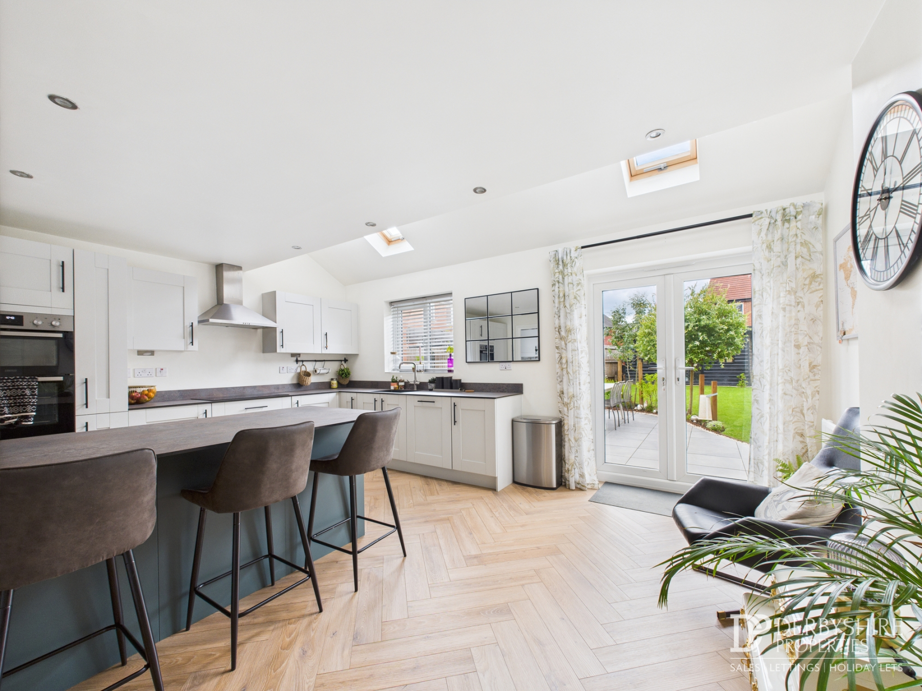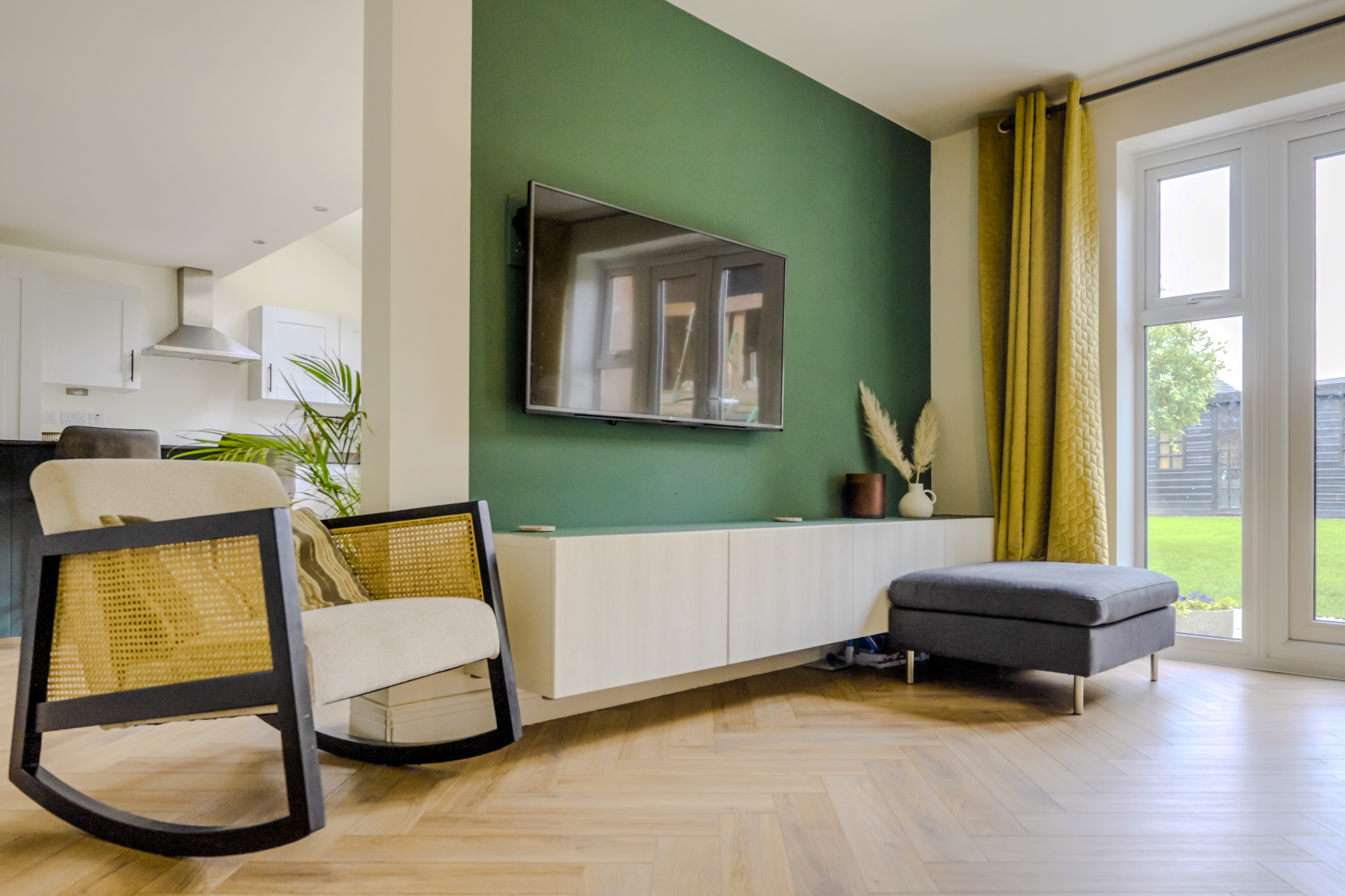 6.49m x 3.56m (21' 4" x 11' 8") This well-proportioned living space flows seamlessly into the stunning open-plan living kitchen, creating a fantastic area for both relaxing and entertaining. Double-glazed French doors with adjoining side panel windows open out onto the rear garden, allowing natural light to flood the room. The space also features a wall-mounted radiator, an additional side window, TV point, designated dining area, and a high-quality wood-effect Amtico floor covering for a stylish, cohesive finish.