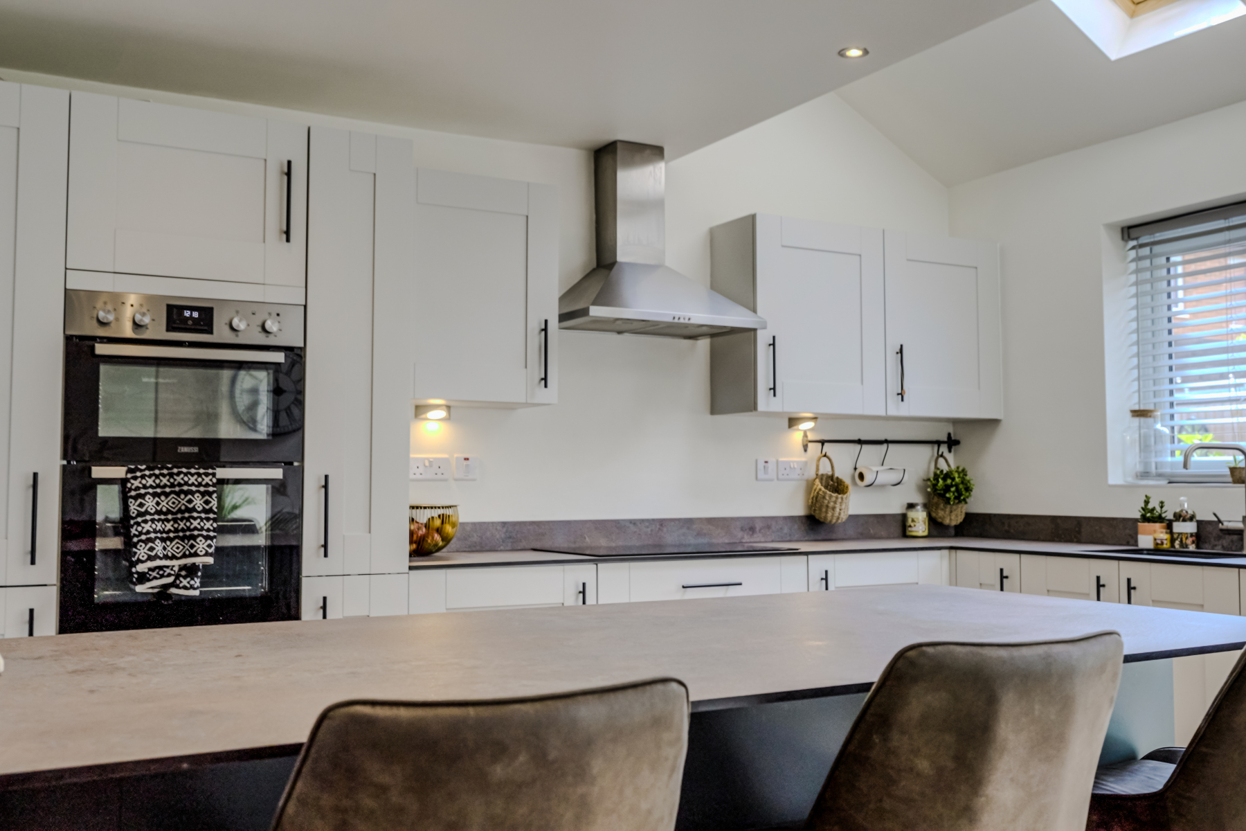 The focal point of the room is the striking central island, finished in a contrasting tone, complete with wine storage and breakfast bar seating for several people—perfect for casual dining or entertaining.