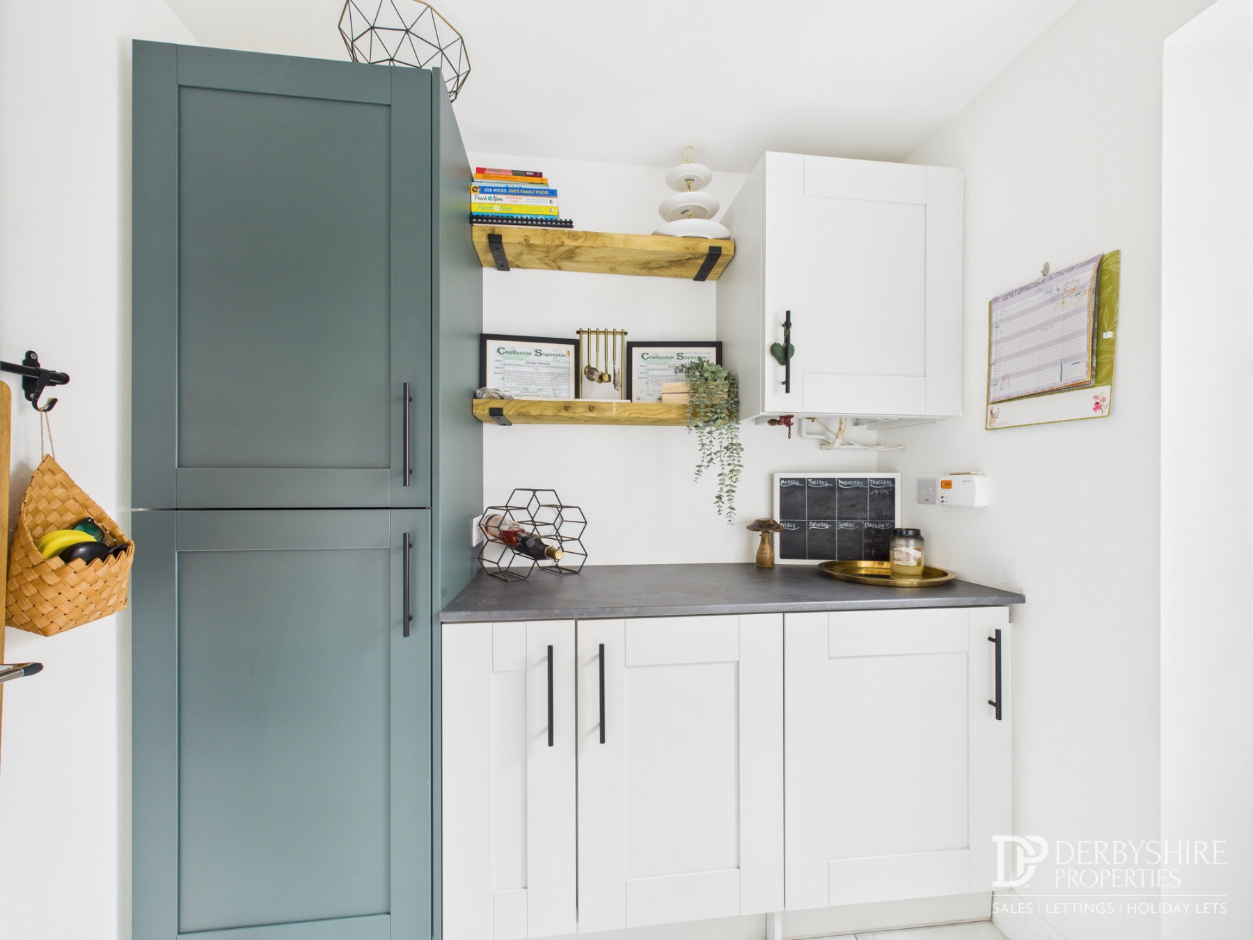 2.10m x 1.95m (6' 11" x 6' 5") A practical and well-designed utility space featuring a continuation of the kitchen cabinetry, including a useful floor-to-ceiling ladder cupboard for additional storage. Scaffold board shelving offers a touch of industrial style, while the wall-mounted combination boiler is neatly housed within a matching cupboard for a seamless look. Finished with a ceramic tiled floor, wall-mounted radiator, a double-glazed window to the side elevation, and space and plumbing for a washing machine/dryer and plumbing for a sink, this room is both functional and stylish.