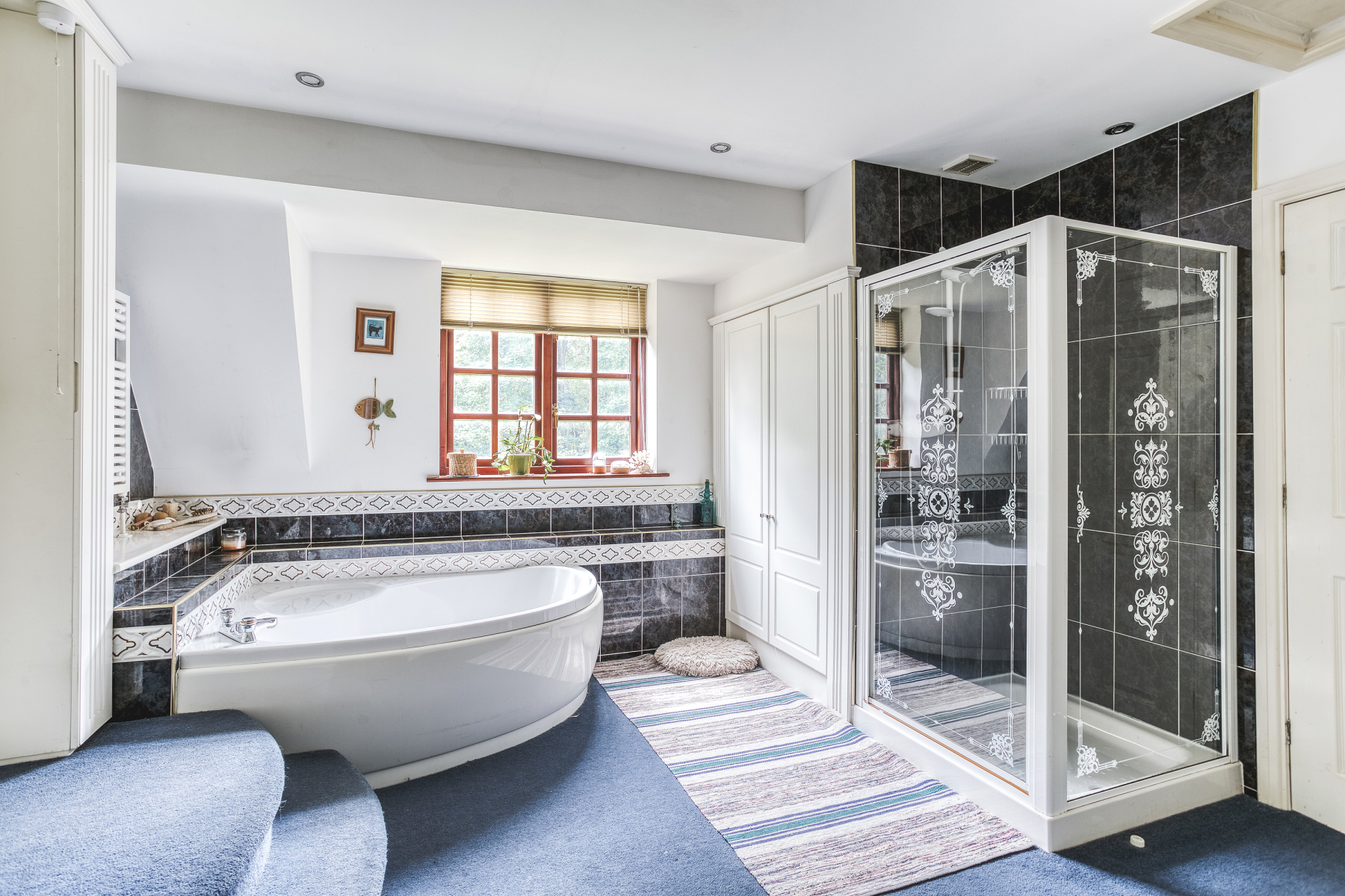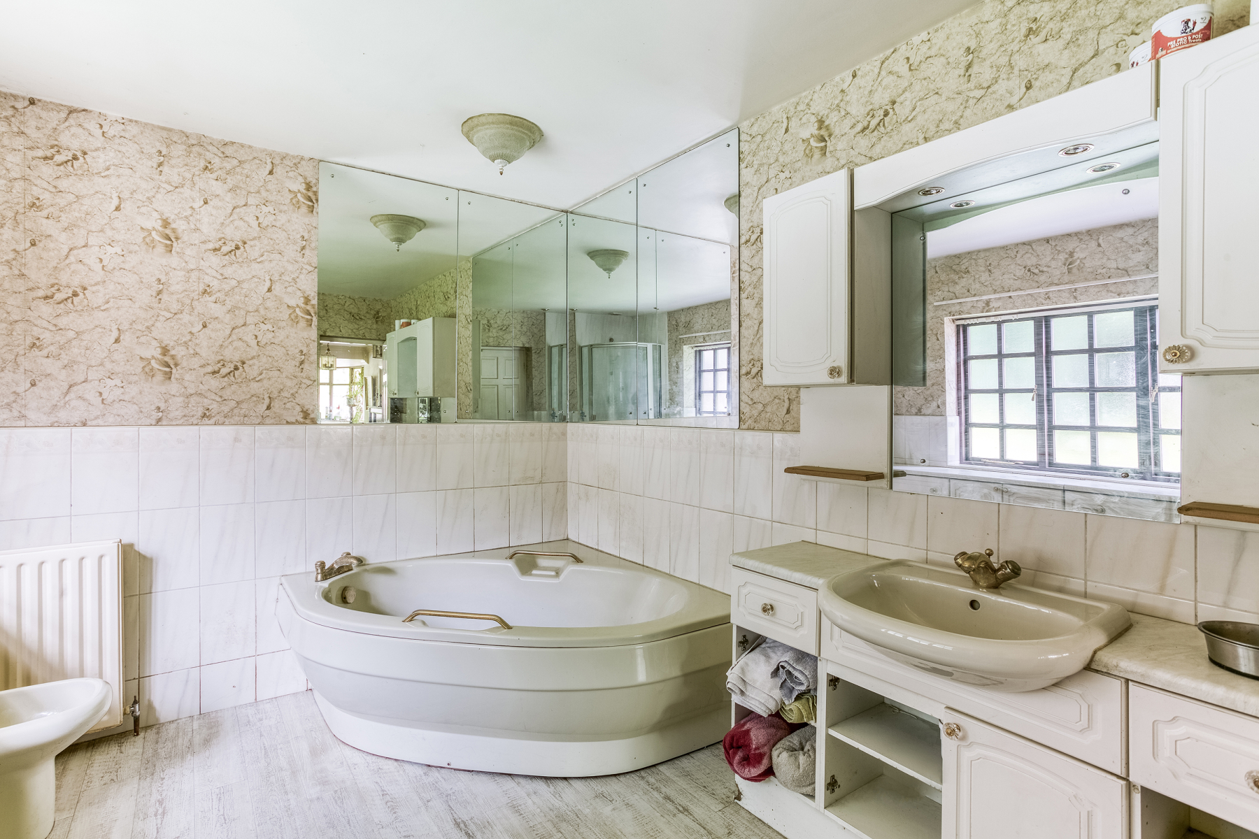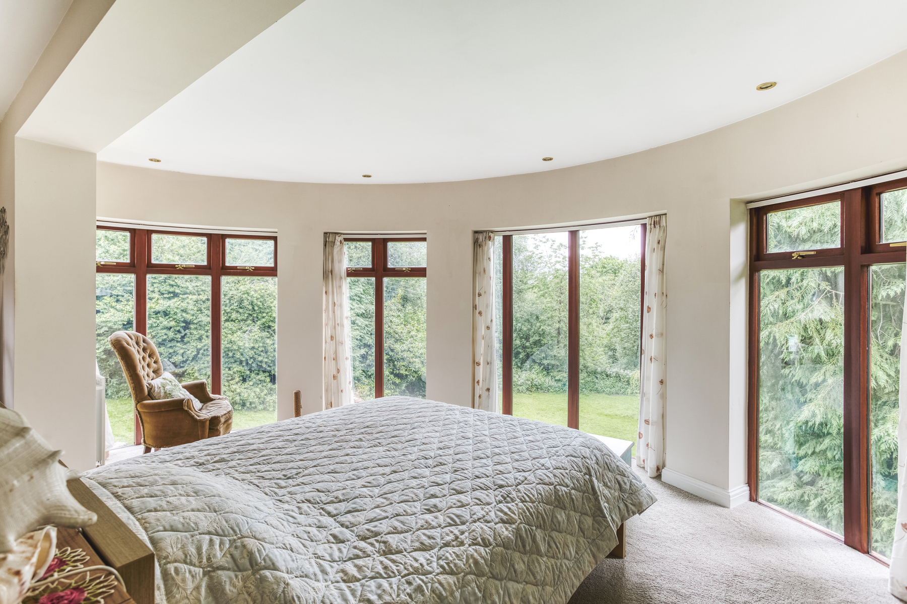 Every room is used and appreciated. The generous windows throughout the house are a huge wow factor, and this is most evident in the breakfast kitchen where the full length windows curve round three sides, giving charming views to garden, creating the sense of relaxed al fresco dining. It was the generous master bedroom suite that sold the house to the owners and they recall walking into it at the viewing and saying,” We have got to have this house.” Its floor to ceiling windows flood the room with light, and as the property is screened by a circle of trees no curtains are needed, enabling you fall to asleep with a calming view of a starry night sky and waken to the morning sun. It is a peaceful adult sanctuary.