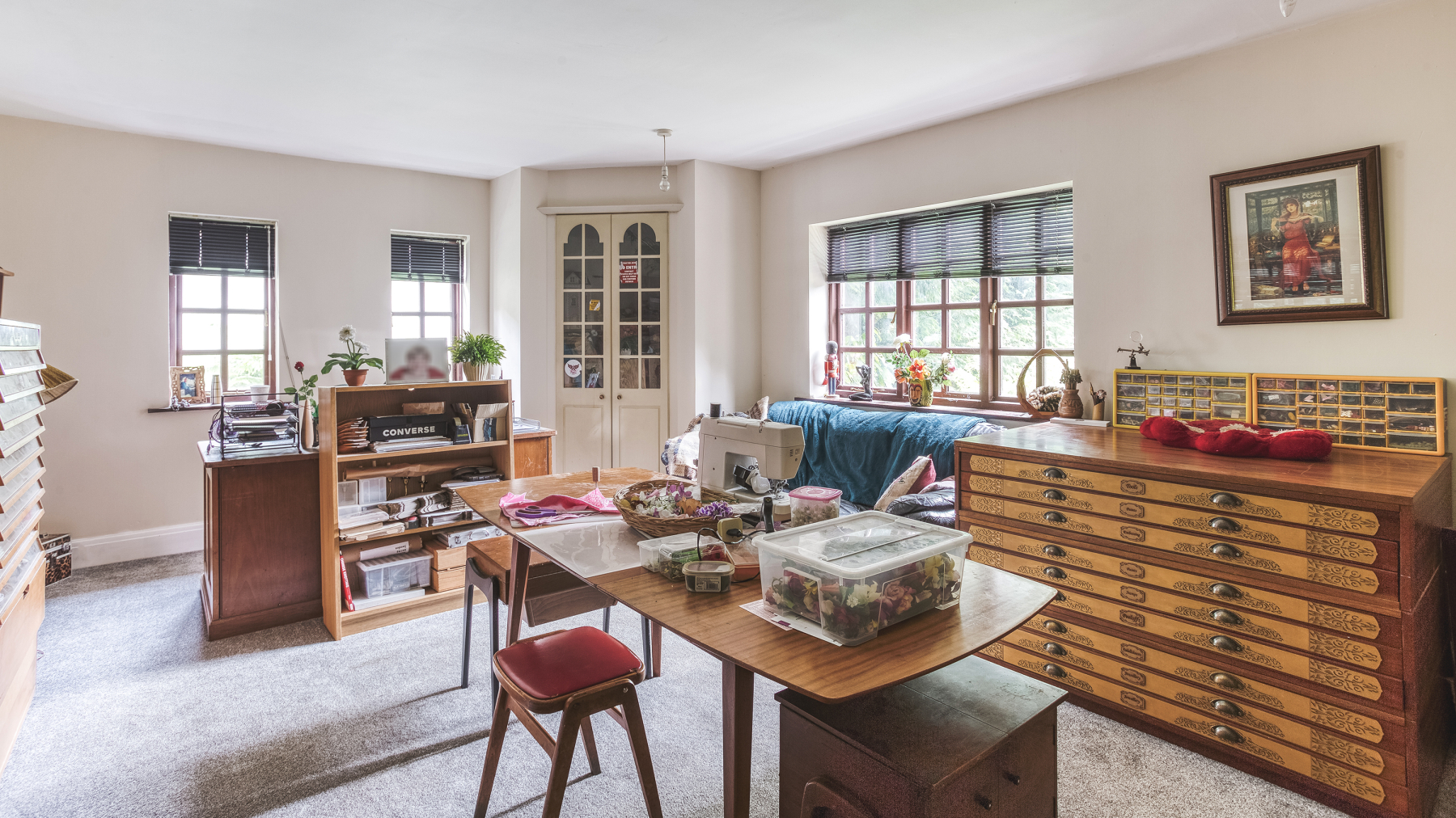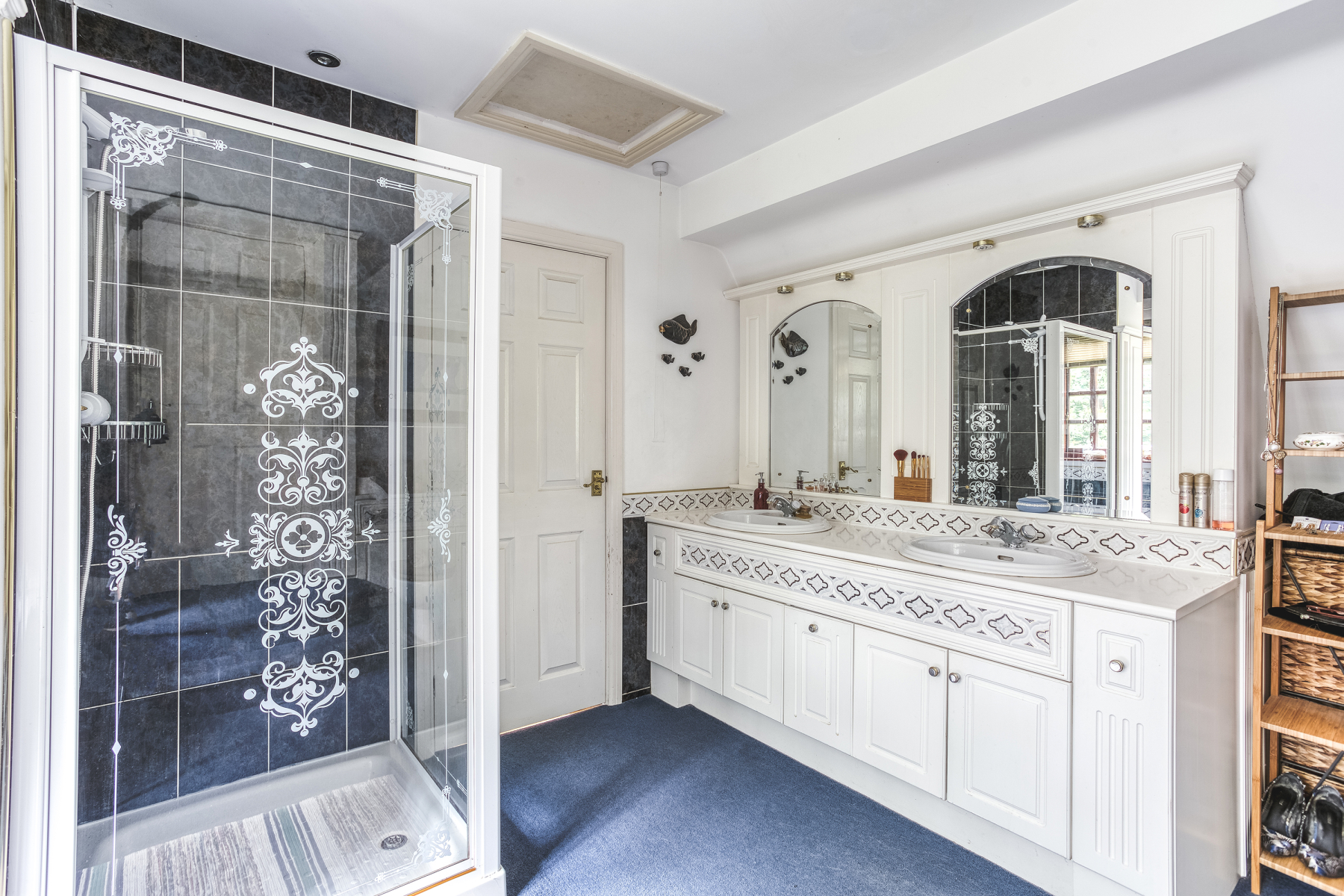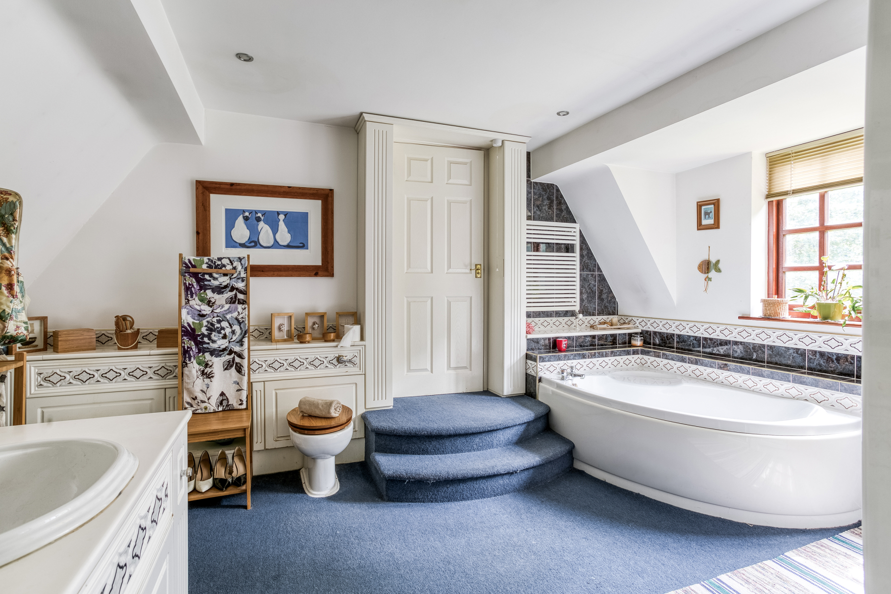 Every room is used and appreciated. The generous windows throughout the house are a huge wow factor, and this is most evident in the breakfast kitchen where the full length windows curve round three sides, giving charming views to garden, creating the sense of relaxed al fresco dining. It was the generous master bedroom suite that sold the house to the owners and they recall walking into it at the viewing and saying,” We have got to have this house.” Its floor to ceiling windows flood the room with light, and as the property is screened by a circle of trees no curtains are needed, enabling you fall to asleep with a calming view of a starry night sky and waken to the morning sun. It is a peaceful adult sanctuary.