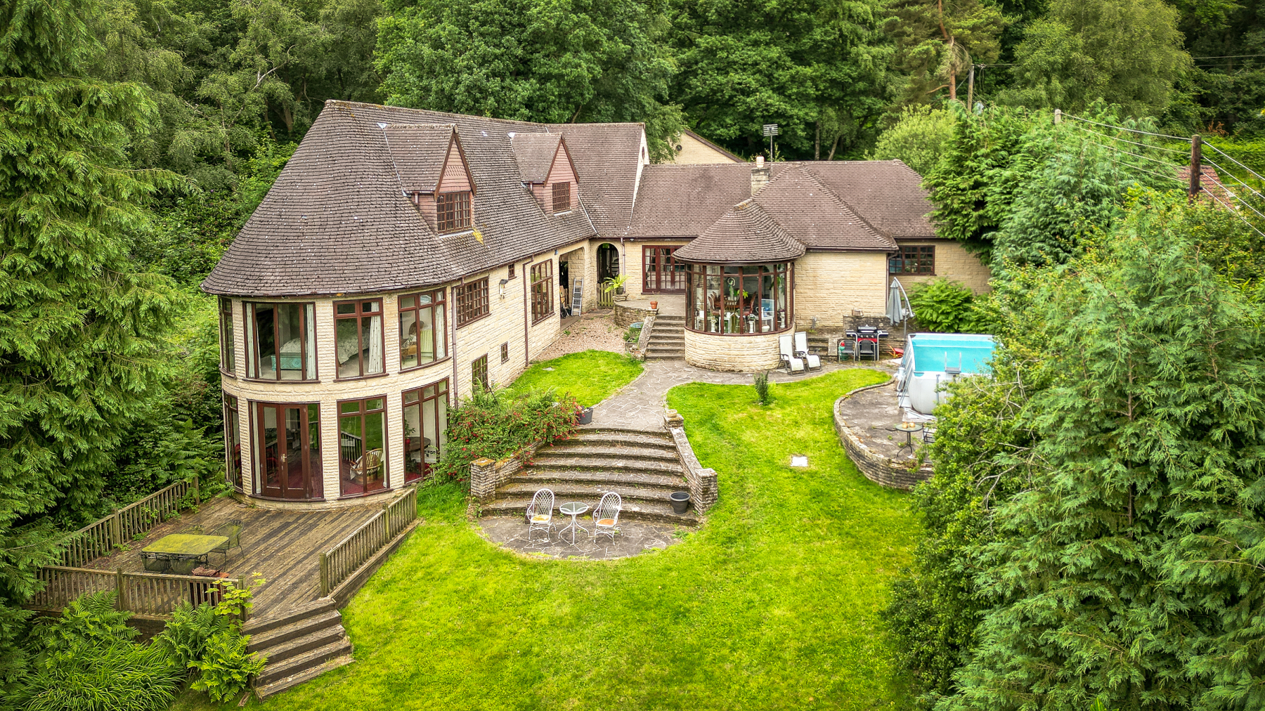 Located underneath the principal bedroom an additional staircase leads to the current owner’s new addition to the home, a beautifully designed library and home office with exquisite wood panelling, mahogany fireplace and full height French doors leading outside to a wide expanse of decking and the gardens beyond. Again, benefitting from a vast amount of natural light due to a further wide expanse of the impressive curved windows which very much define this property.