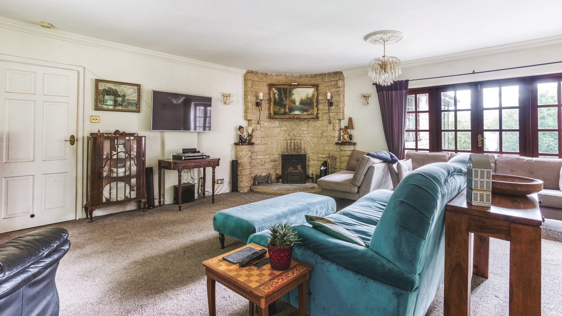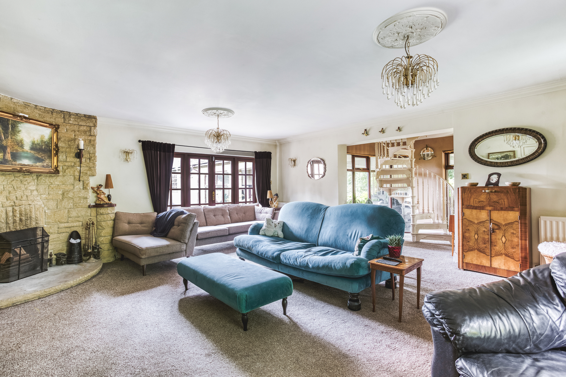 To the right, the hallway opens into a beautifully light and elegant lounge. Light floods through imposing windows at the rear of the room which look out across the gardens and woodland beyond, and a set of French patio doors leads to the patio outside. This is a room for all seasons highlighted by an impressive curved stone feature fireplace housing an open fire grate sitting on a stone hearth.