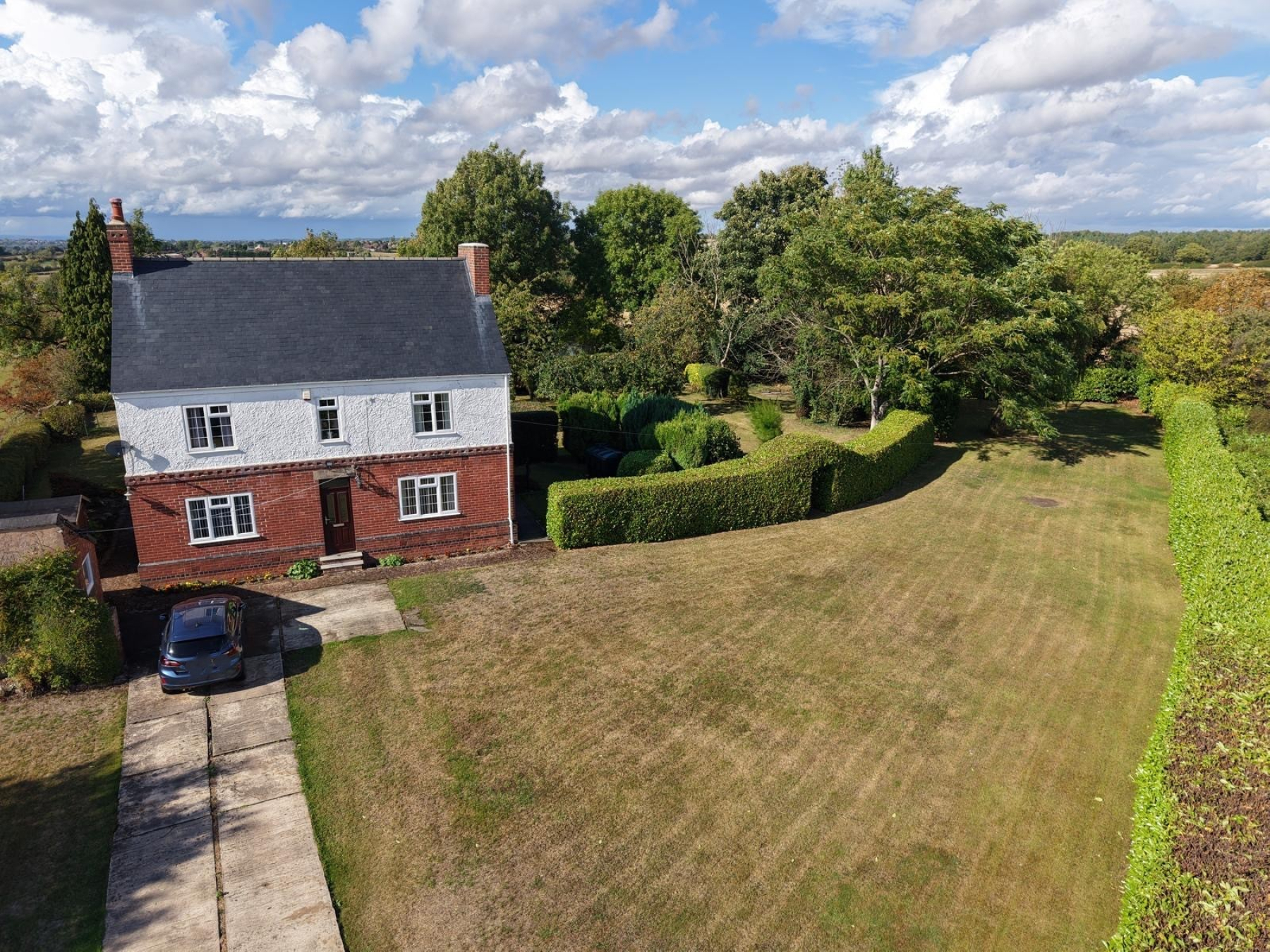 Externally, the property is set upon one acre of wonderful gardens with impressive countryside views to all aspects but none more so than the stunning view to rear elevation where patio area overlooks miles of fields and greenery. Elsewhere throughout the gardens, there are fruit trees and incredibly well maintained mature shrubbery which ensure many private spaces to relax. To the front elevation, there is a sweeping driveway fit to house several cars.