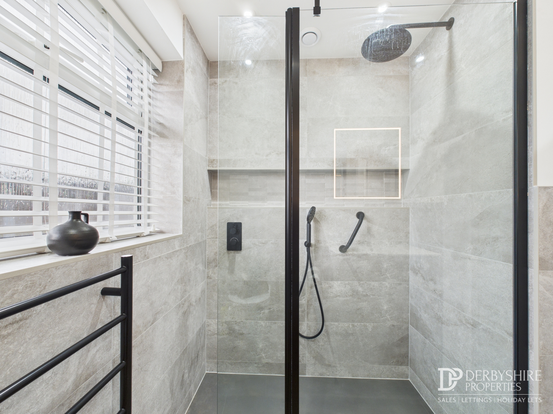 2.17m x 2.06m (7' 1" x 6' 9") This lovely, newly fitted shower suite offers a calm, boutique hotel feel. It features an enclosed WC and a stylish vanity unit with an inset sink, creating a practical yet elegant space. The spacious wet room-style shower enclosure includes a mains-fed rainfall shower and a handy attachment, perfect for relaxing showers. Additional thoughtful touches include a double glazed obscured window for privacy, a gently illuminated and heated bathroom mirror cabinet, tiled flooring, and a warm, wall-mounted heated towel rail.