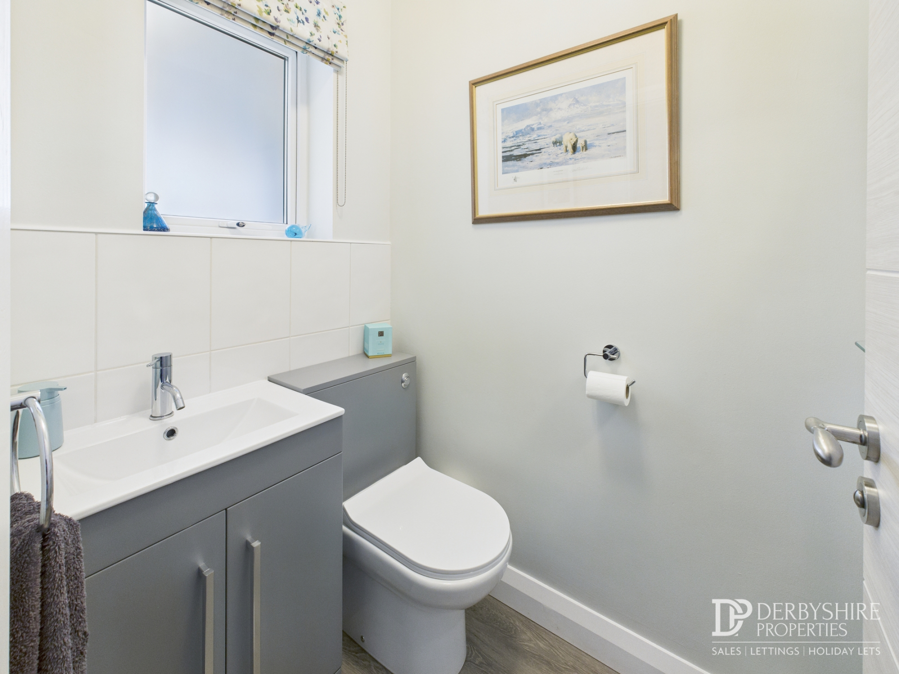 Fitted with a low-level WC and a vanity unit incorporating an inset sink with storage cupboards beneath. Finished with laminate flooring, part-tiled walls, double glazed obscured window, ceiling-mounted extractor fan, and a wall-mounted chrome heated towel rail.