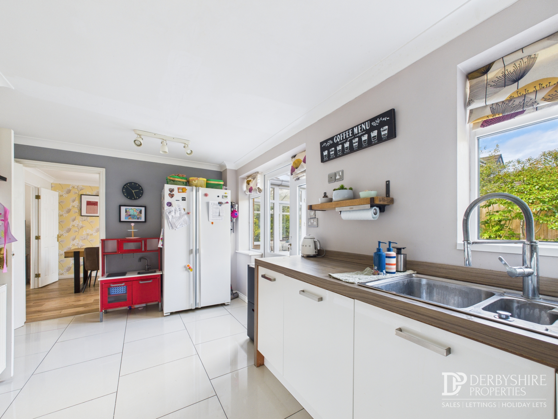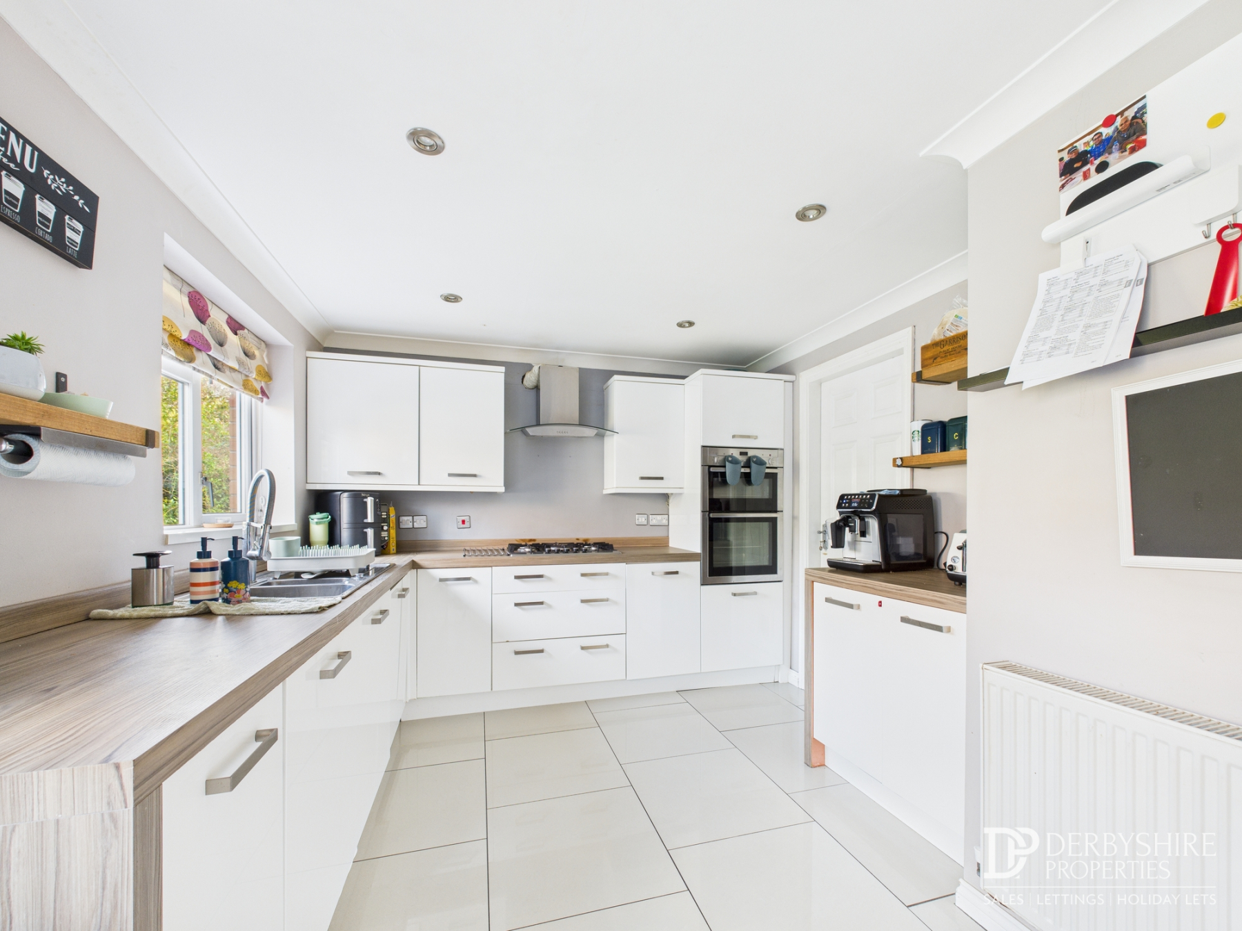 Comprising a range of modern wall and base-mounted matching white gloss units, incorporating a one-and-a-half bowl stainless steel sink with drainer. The kitchen features under-cupboard lighting and a variety of integrated appliances, including a dishwasher, washing machine, double electric oven, and five-ring gas hob with stainless steel extractor canopy. There is space for an American-style fridge freezer. The room benefits from a tiled floor, wall-mounted radiator, shelving, decorative coving to the ceiling, and both a window and door to the rear elevation. An internal door provides access to the attached double garage.