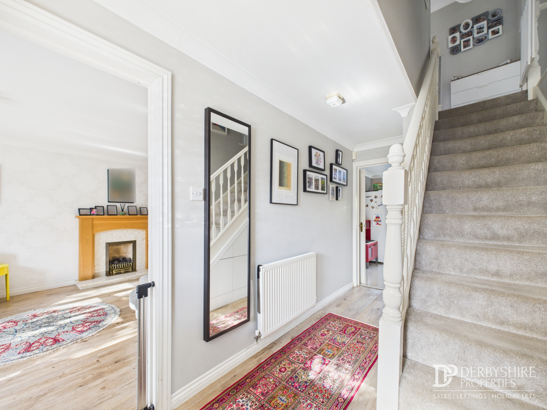 Entered via a door from the front elevation, the entrance hall features a wood floor covering, wall-mounted radiator, carpeted staircase leading to the first-floor landing, decorative coving to the ceiling, and an obscured double-glazed window. Internal doors provide access to both the living room and kitchen.