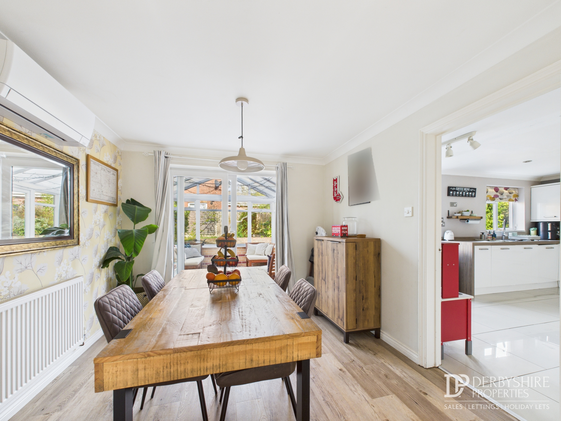 With continuation of the flooring from the lounge area, wall mounted radiator, decorative coving to the ceiling, and a wall mounted air-conditioning unit providing both cooling and heating options. An internal door gives access to the kitchen, while UPVC sliding patio doors open through to the :-