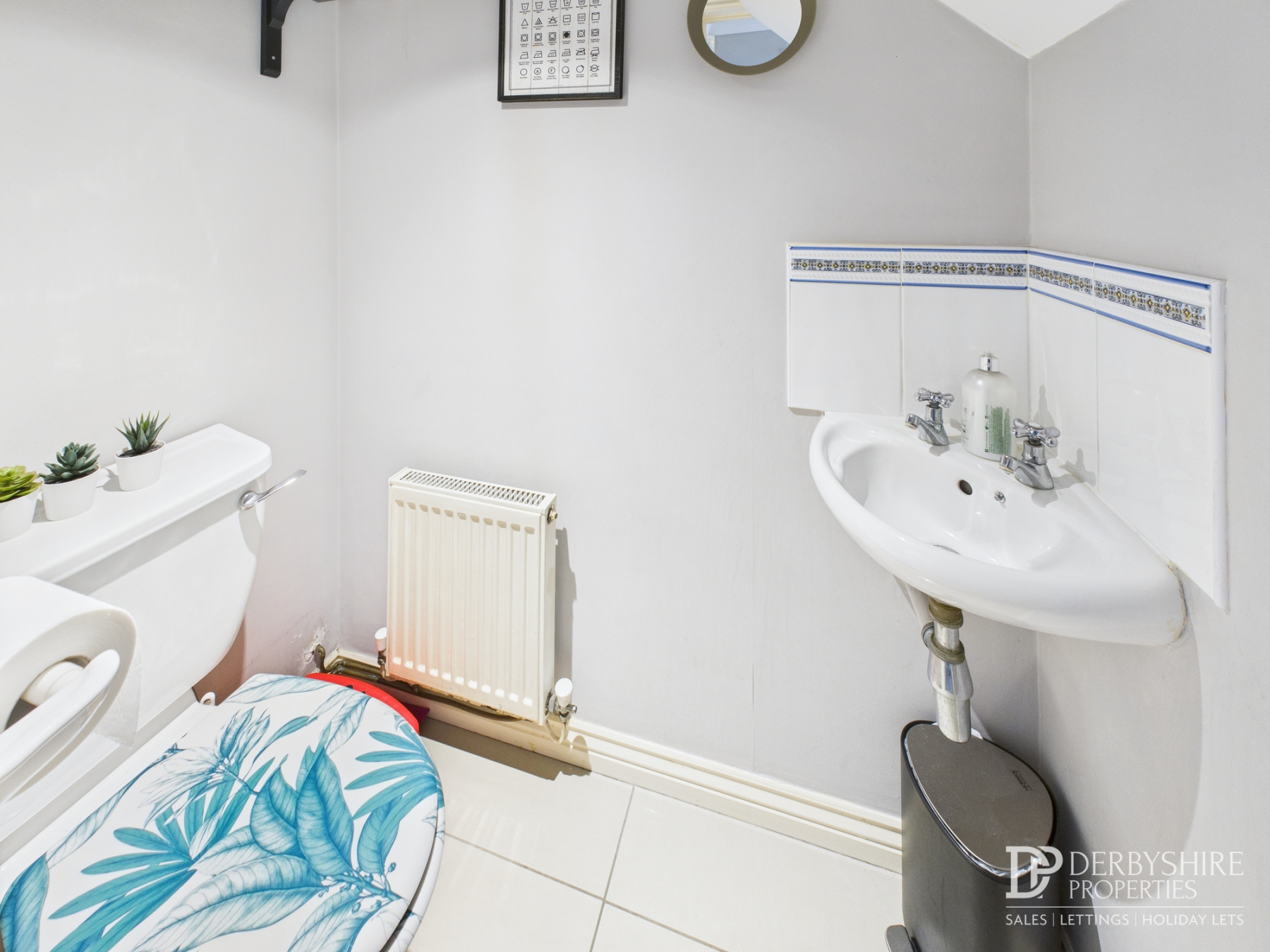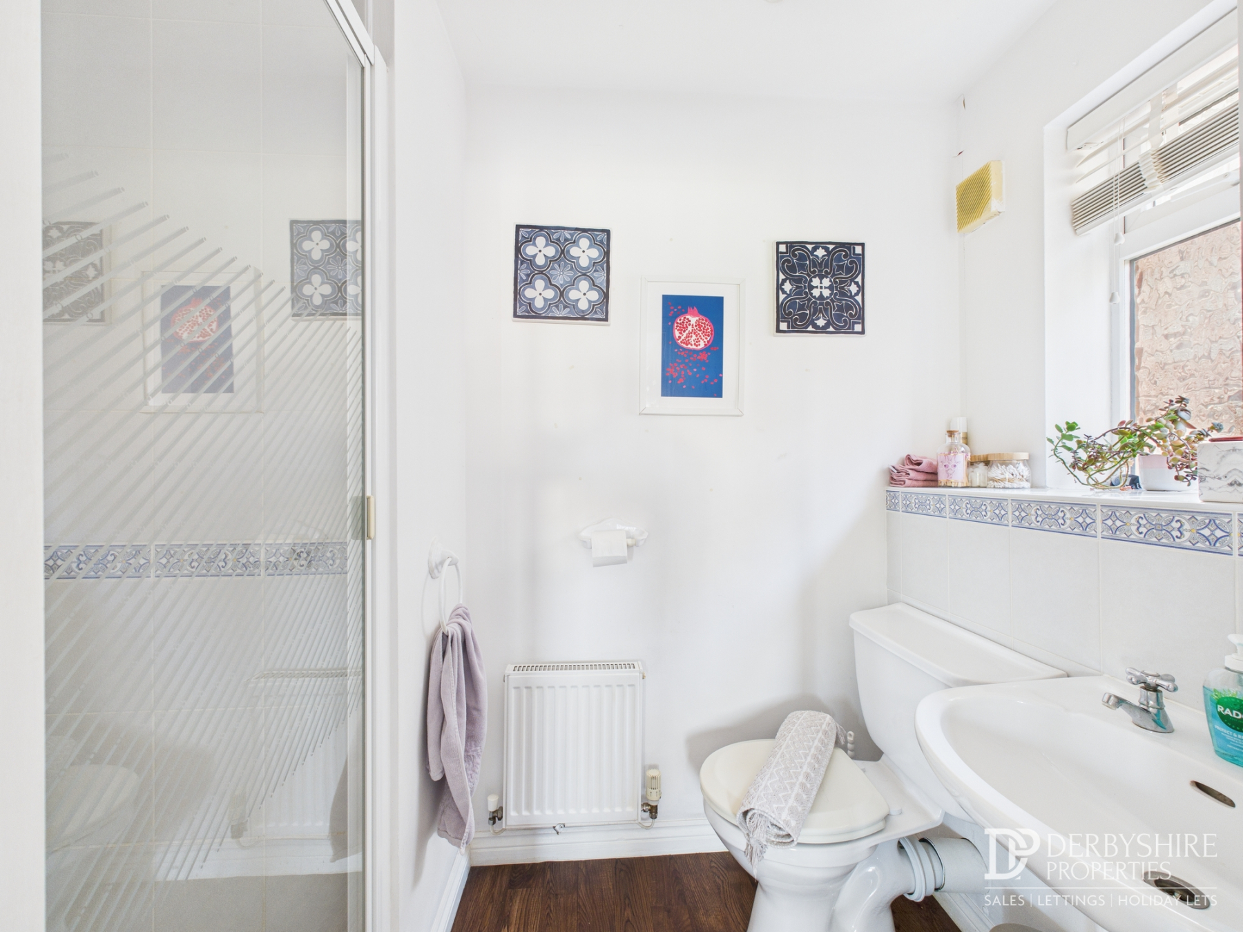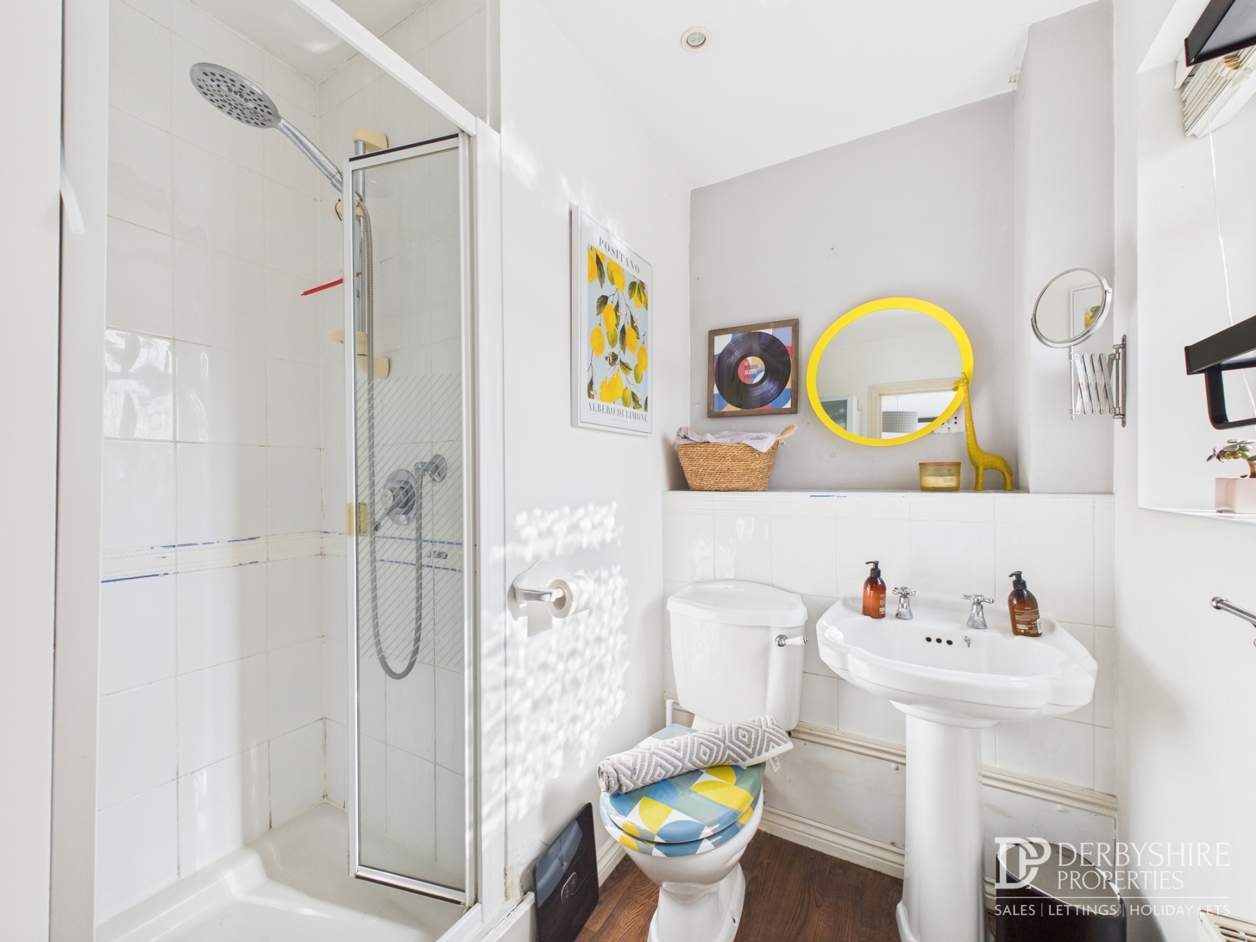Comprising a three-piece suite including WC, pedestal wash handbasin, and shower enclosure with mains-fed shower and attachment. Features include wood floor covering, part-tiled walls, spotlighting, extractor fan, and double-glazed obscured window.